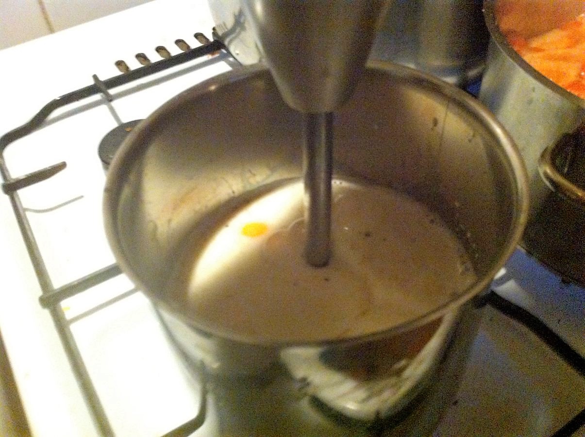 Dann sofort mit einem Handrührer, Pürierstab, Zauberstab in den Topf gehen und das Rührgerät permant laufen lassen, damit sich die Zutaten gut miteinander vermischen.