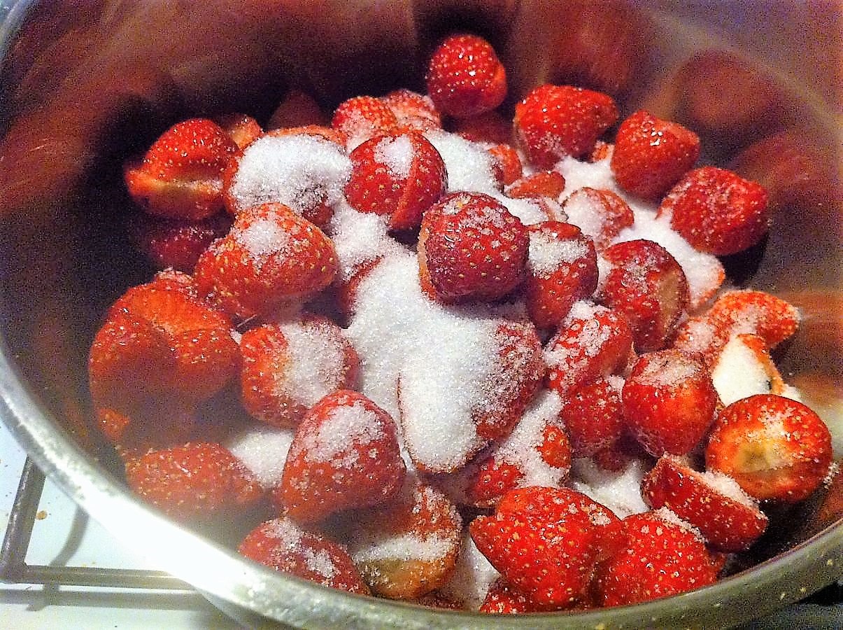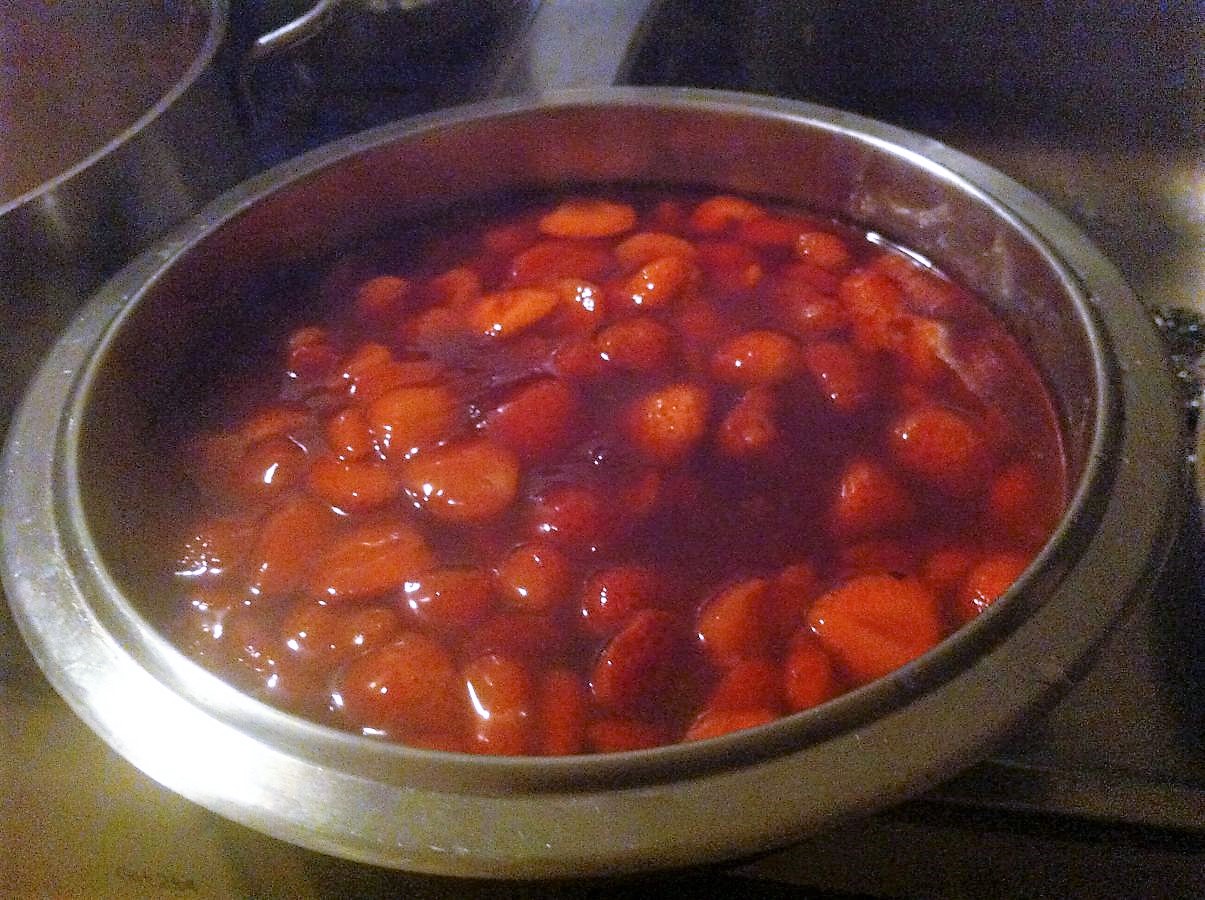 Wir waren am Sonntag da, abends 19 Uhr war Feierabend und die nächste Veranstaltung für die Schausteller war erst am folgenden Wochenende. Alles was verderblich war, musste also weg. Plötzlich stand ich da mit 10 Kilo super frischen Erdbeeren Handelsklasse 1 und nachdem ich mich für die tolle Gabe überschwänglich bedankt habe und die Kinder davon abhalten musste, sie gleich auf der Stelle zu verzehren, durfte ich mir etwas ausdenken, was ich damit anstellen könnte, bevor sie dem Verfall geweiht sind. .
