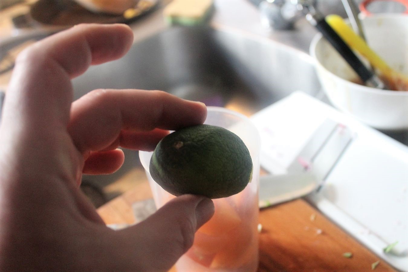 Den Saft einer halben Limette in den Mixbecher geben. Ich drücke die Limette direkt darüber aus.