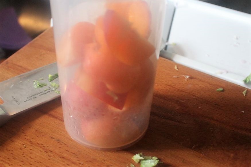 Nun mit dem Pürierstab die Aprikosen zerkleinern.