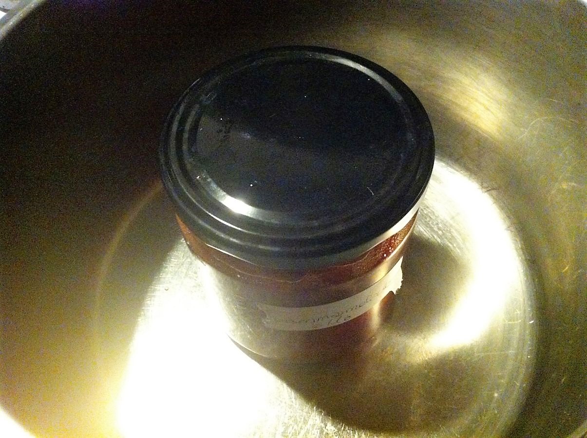 Damit man nicht die ganze Küche beim Einfüllen einsaut, stelle ich die Gläser in einen kleineren Kochtopf. Danach die Deckel fest zudrehen. Durch die heiße Marmelade wird im Glas ein Vakuum gebildet und das kann man daran hören, wenn der Deckel knackt.