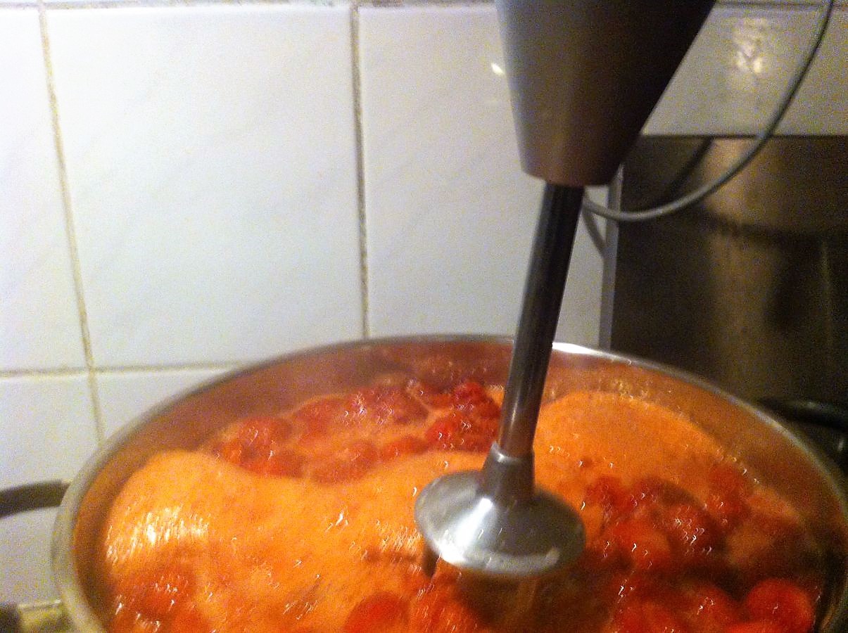 Ich püriere die Erdbeermarmelade mit dem Esge Zauberstab, aber nur so dass auch noch Früchte sichtbar bleiben.