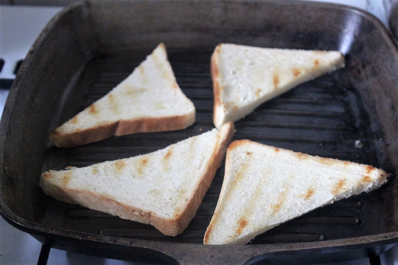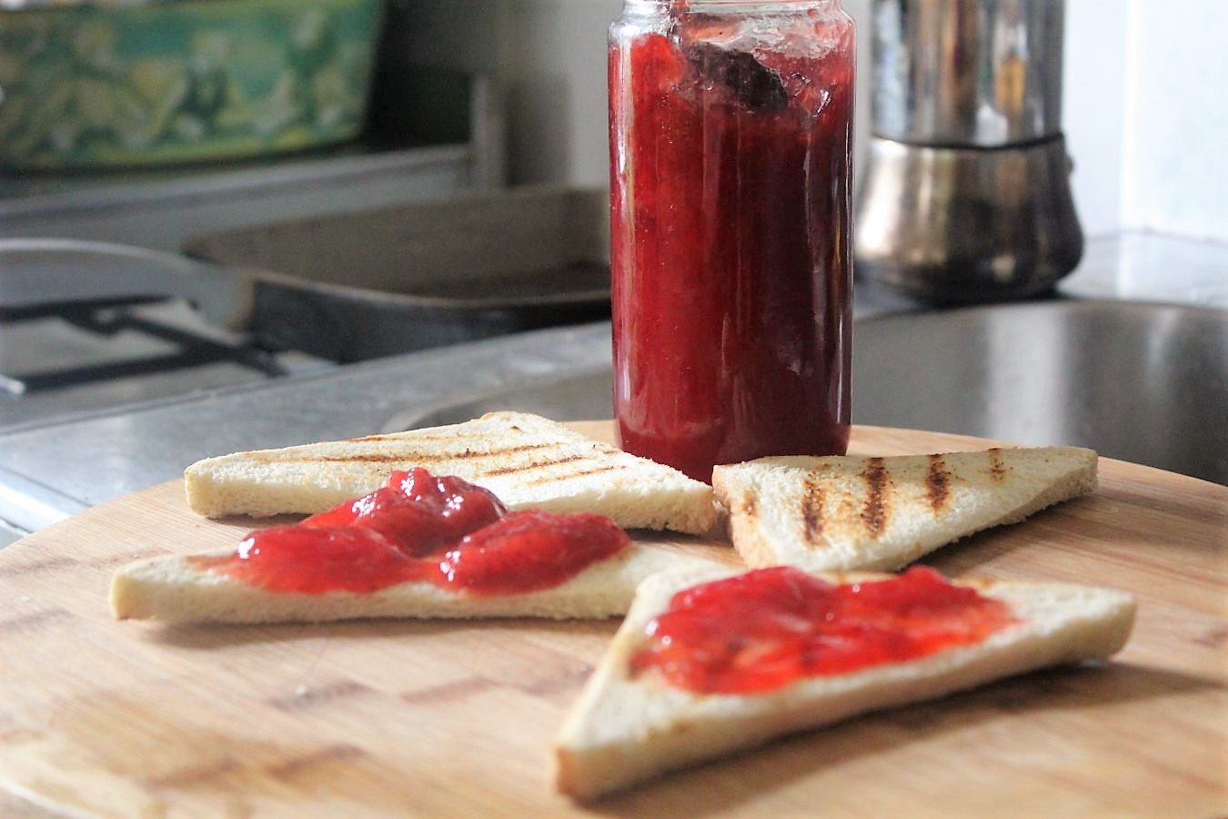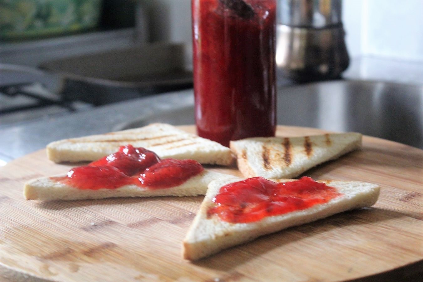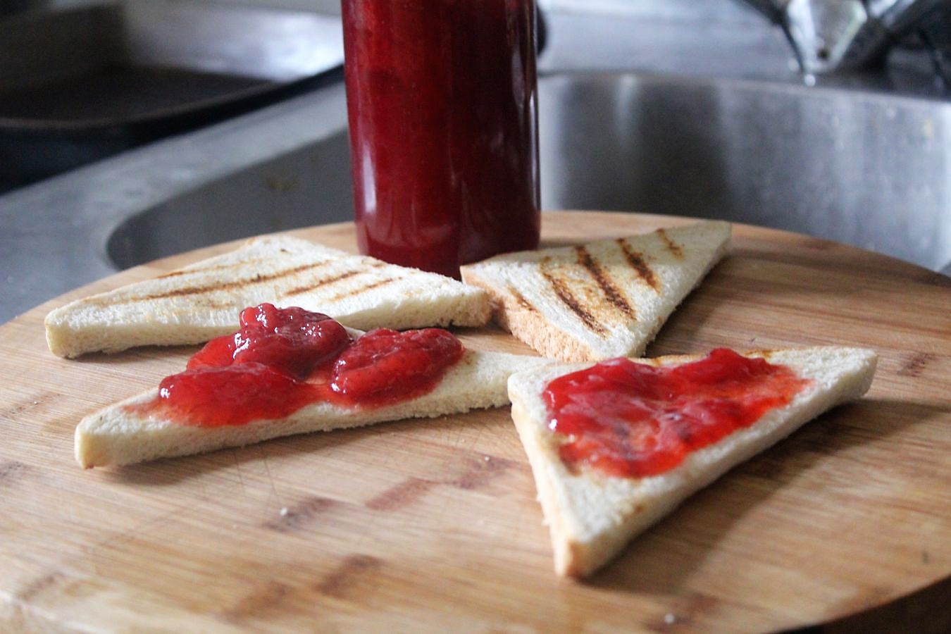 Toast von beiden Seiten darin kross ausbraten. Das schmeckt schon ganz anders als einfach nur getoastet, wenn die Pfanne mit Butter bestrichen wird. Genau der richtige Rahmen für die “ehrliche” Erdbeermarmelade.