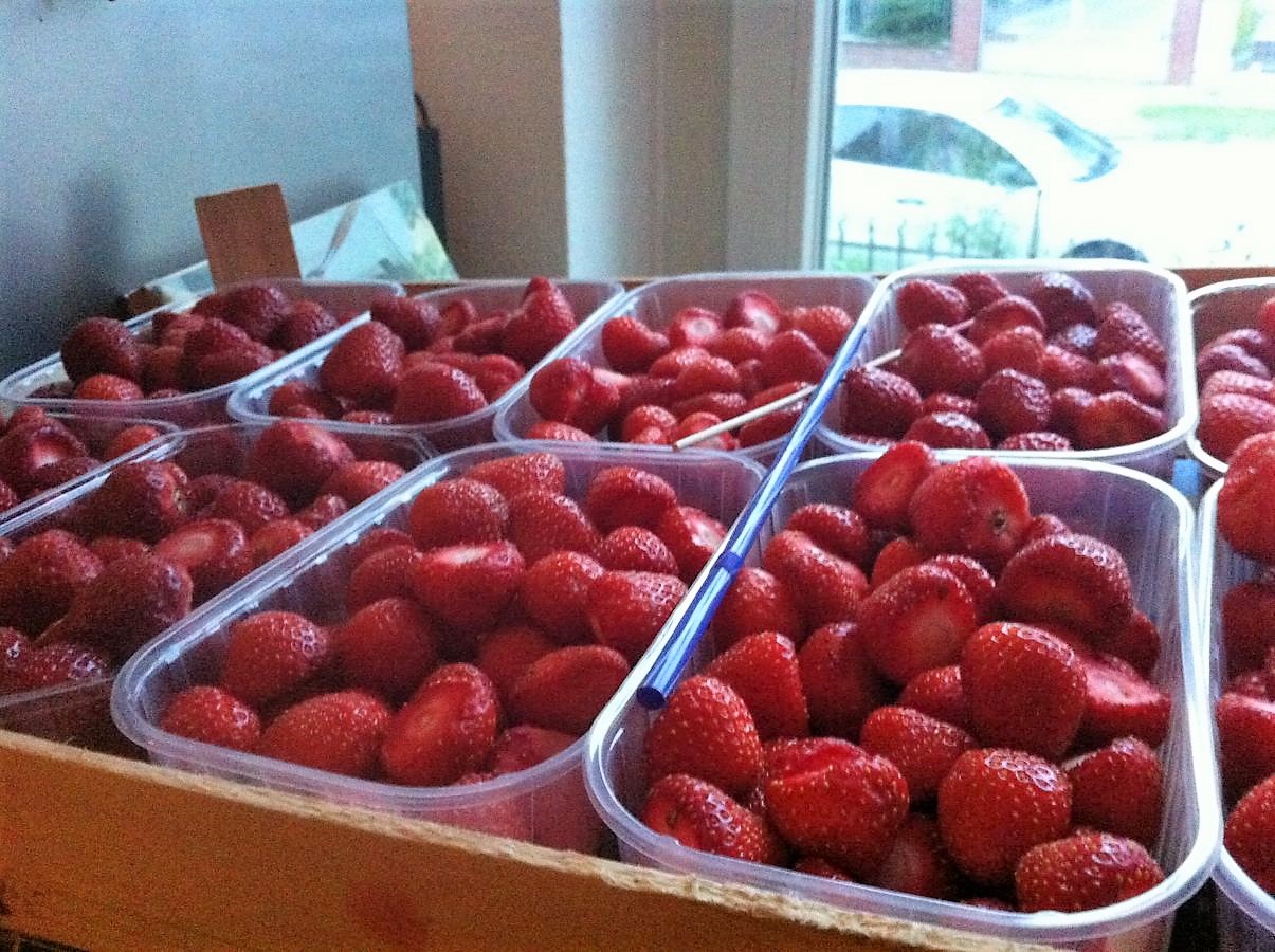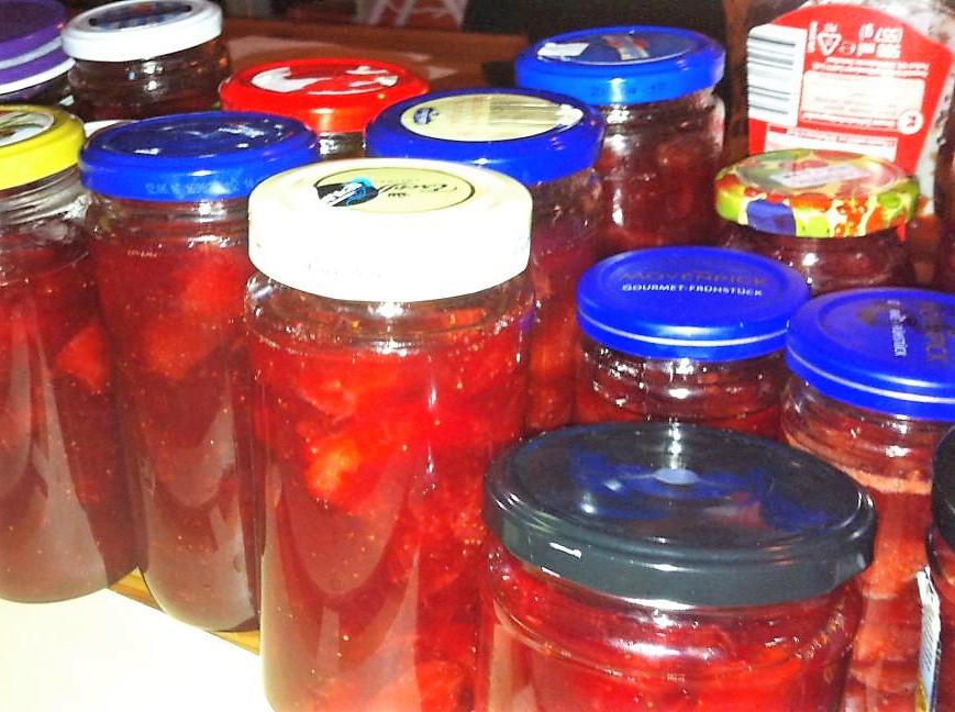 Aus der Menge Erdbeeren habe ich 23 Gläser Erdbeermarmelade mittlerer Größe gemacht. Damit komme ich schon irgendwie bis zum nächsten Jahr.