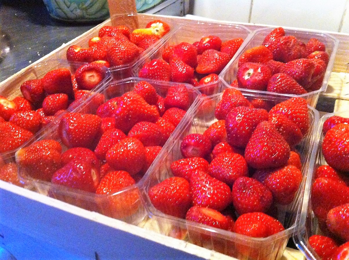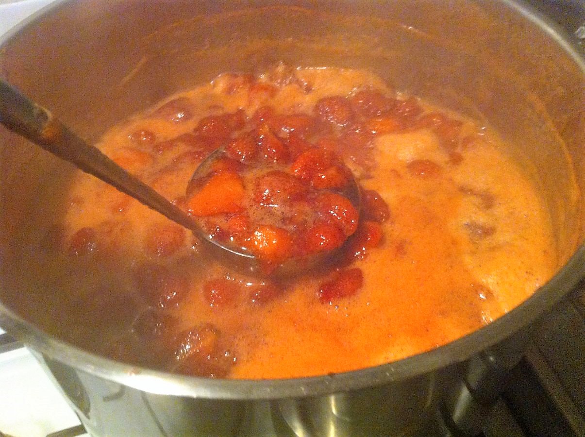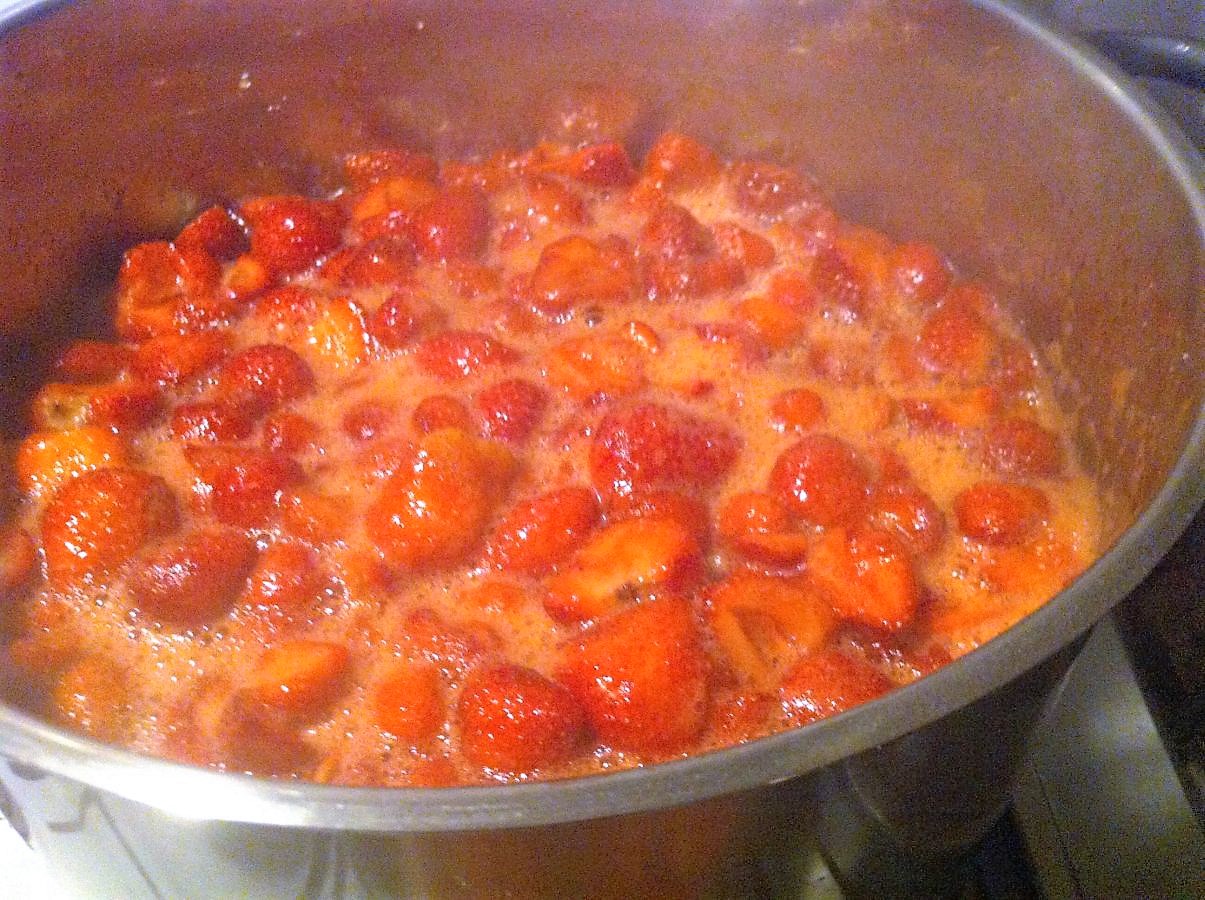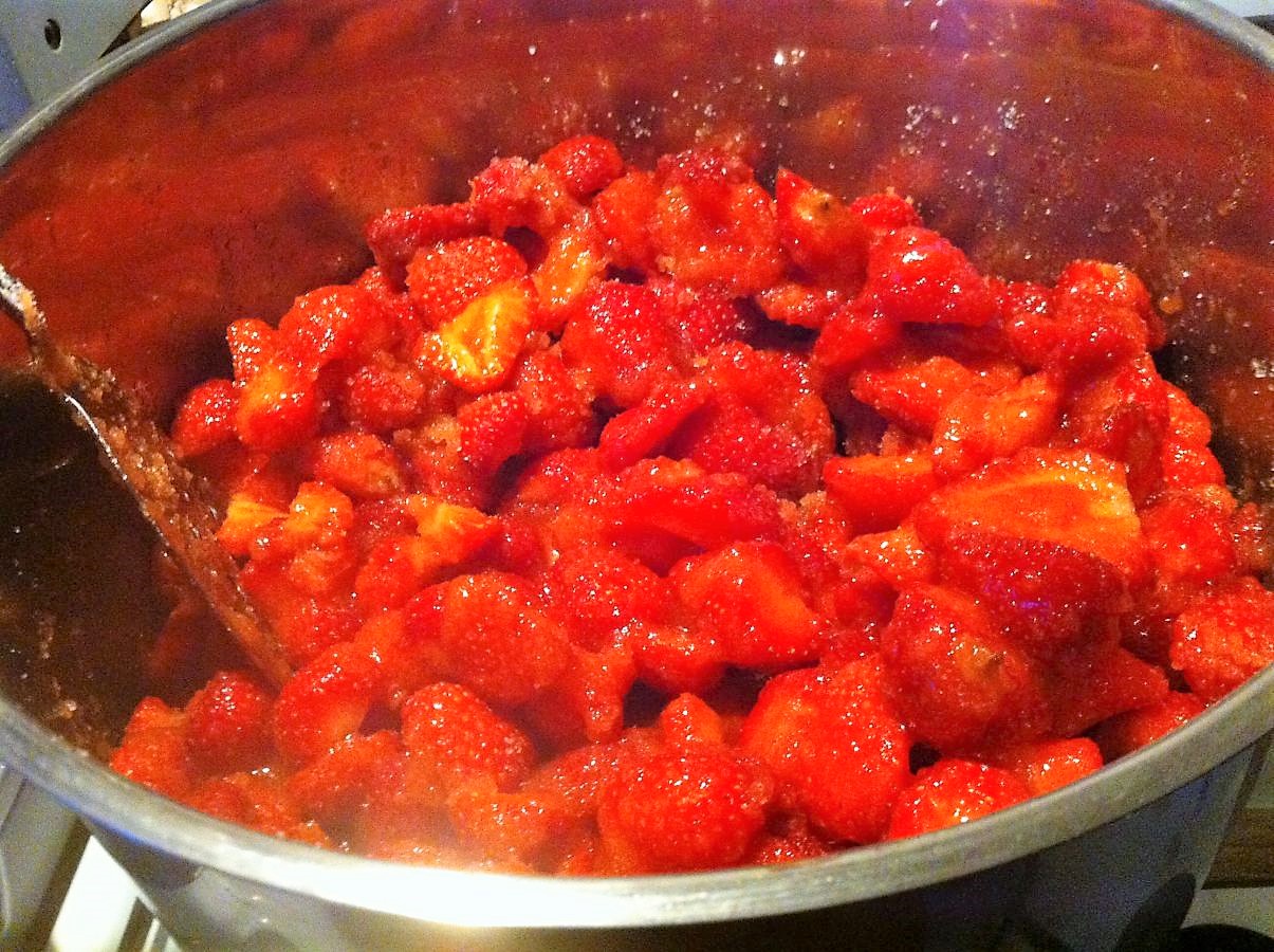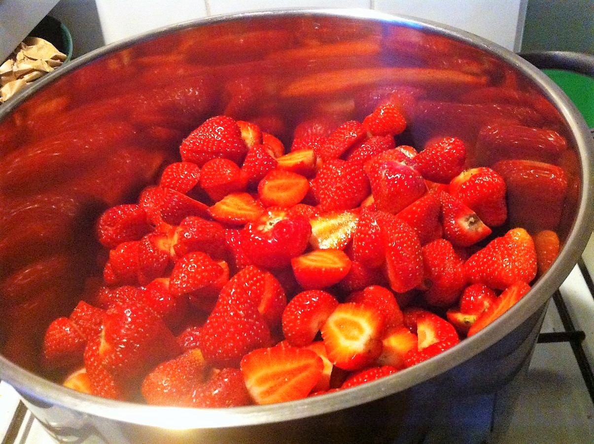 Ich habe das schon bei meiner Erdbeergrütze erzählt, dass ich zehn Kilo Erdbeeren geschenkt bekommen habe. Sieben davon habe ich zu Marmelade verarbeitet.