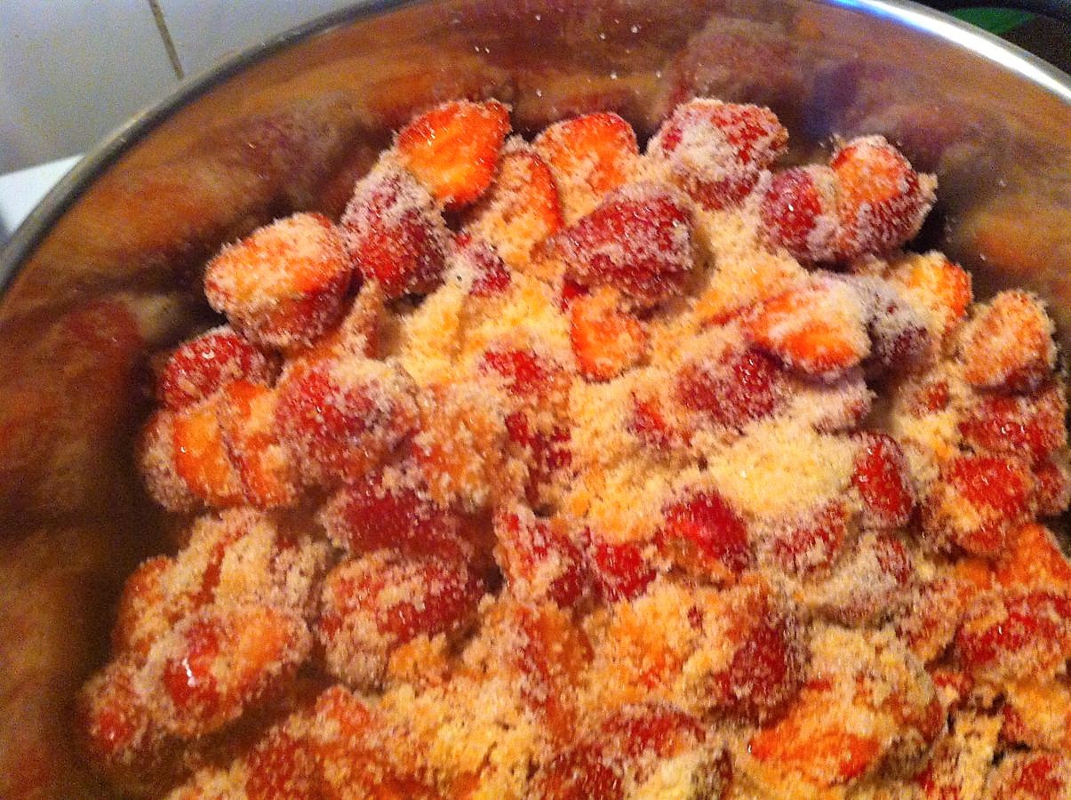 7 Kilo Erdbeeren und 3,5 Kilo Gelierzucker 2 zu 1 im Topf. Erdbeeren mit dem Gelierzucker vermischen und drei Stunden ziehen lassen. Das geht natürlich auch mit weniger, oder mehr Früchten und Gelierzucker im gleichen Mischungsverhältnis.