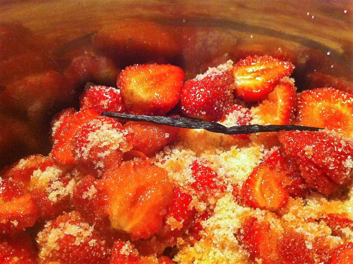 Nach mindestens drei Stunden, die Erdbeeren mit dem Zucker erneut verrühren und den Herd auf mittlerer Temperatur anstellen.