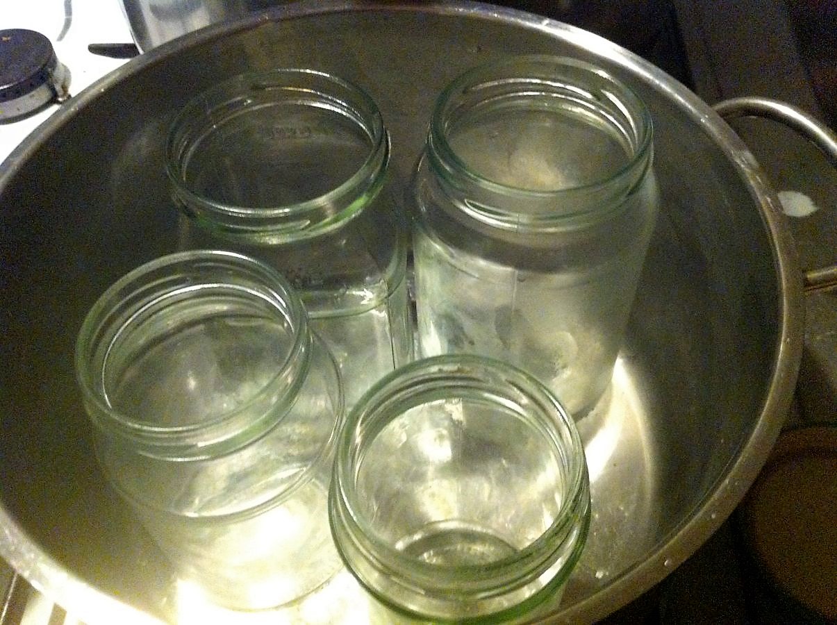 Die Marmeladengläser sterilisiere ich währenddessen noch schnell in kochendem Wasser, damit die Marmelade länger hält