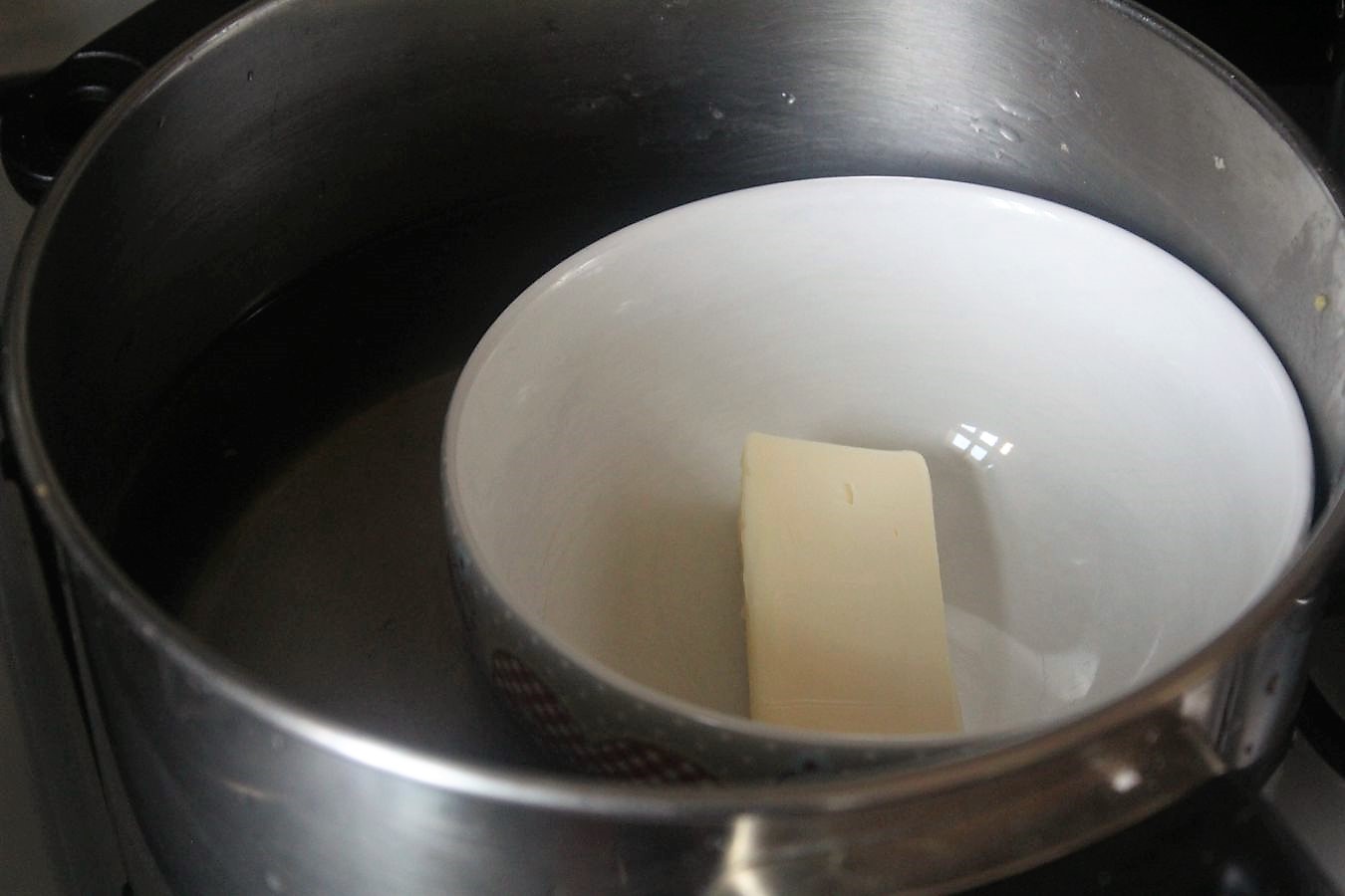 Einen kleinen bis mittelgroßen Topf mit Wasser befüllen. Eine Schüssel hineinstellen, die ungefähr zur Hälfte im Wasser stehen soll.
