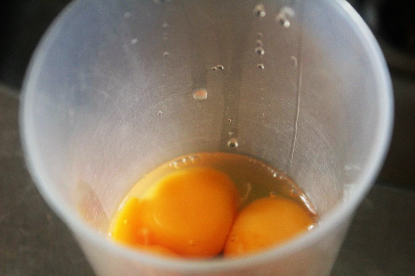 In der Zwischenzeit in einem Mixbecher drei Eigelb vom Eiweiß trennen