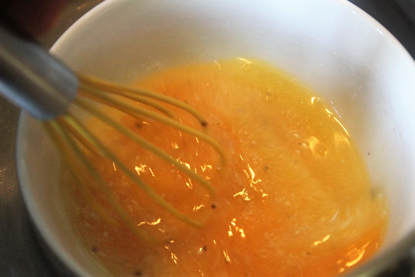 Unter ständigem Rühren mit dem Schneebesen, kommt das Eigelb mit den anderen Zutaten aus dem Mixbecher, in die angewärmte Schüssel mit der geschmolzenen Butter, die noch im Wasserbad steht.