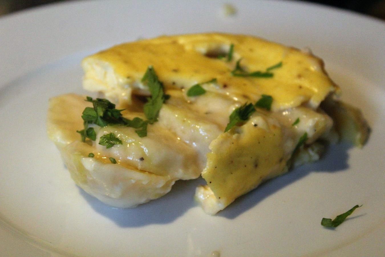 Ich finde das Gericht sehr wertvoll, weil man da eine Menge über Soßen lernen kann. Das ist ja ungefähr sowas, als wenn man den Tütenschrott für Gratin etc. verwenden würde, oder diese Pampe, ich glaube die ist von Uncle Bens, bei der man so einen ganz fiesen grauen Fensterkitt aus dem Glas über die Kartoffeln gibt. Am besten noch über vorgekochte Kartoffeln aus dem Glas. Wer den degenerierten Geschmack kennt, wird beim Probieren dieser frischen Version vor Begeisterung Purzelbäume schlagen. Das ist keine dumme Soße, die mit noch mehr dummem Käse von oben versteckt wird. Achtet mal drauf, daran erkennt Ihr die echten Kandidaten. An der Käsemenge unter der sie Ihr Essen verstecken.
