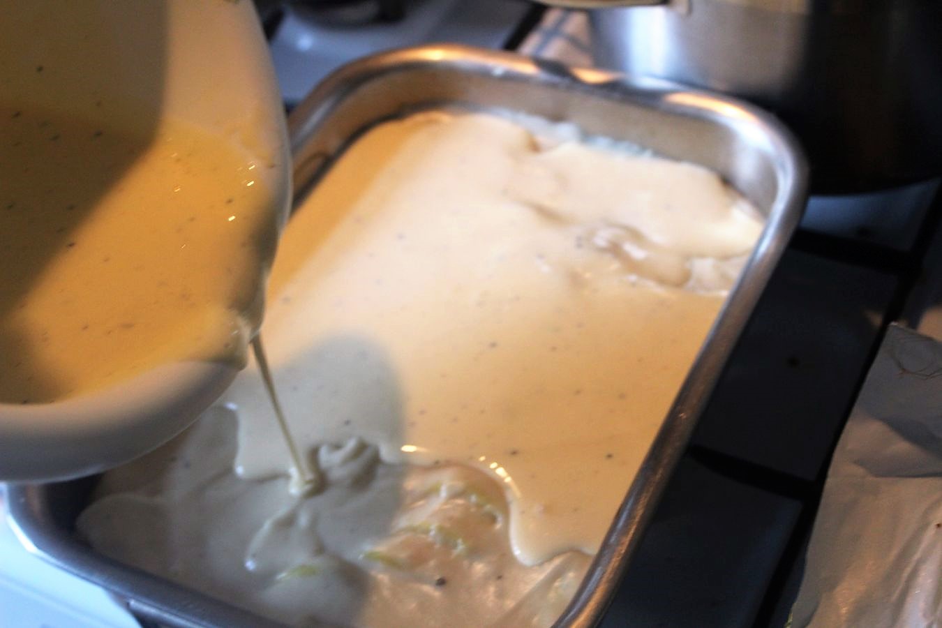 Tapetenklei… äh Soße über die geschichteten Kartoffeln geben