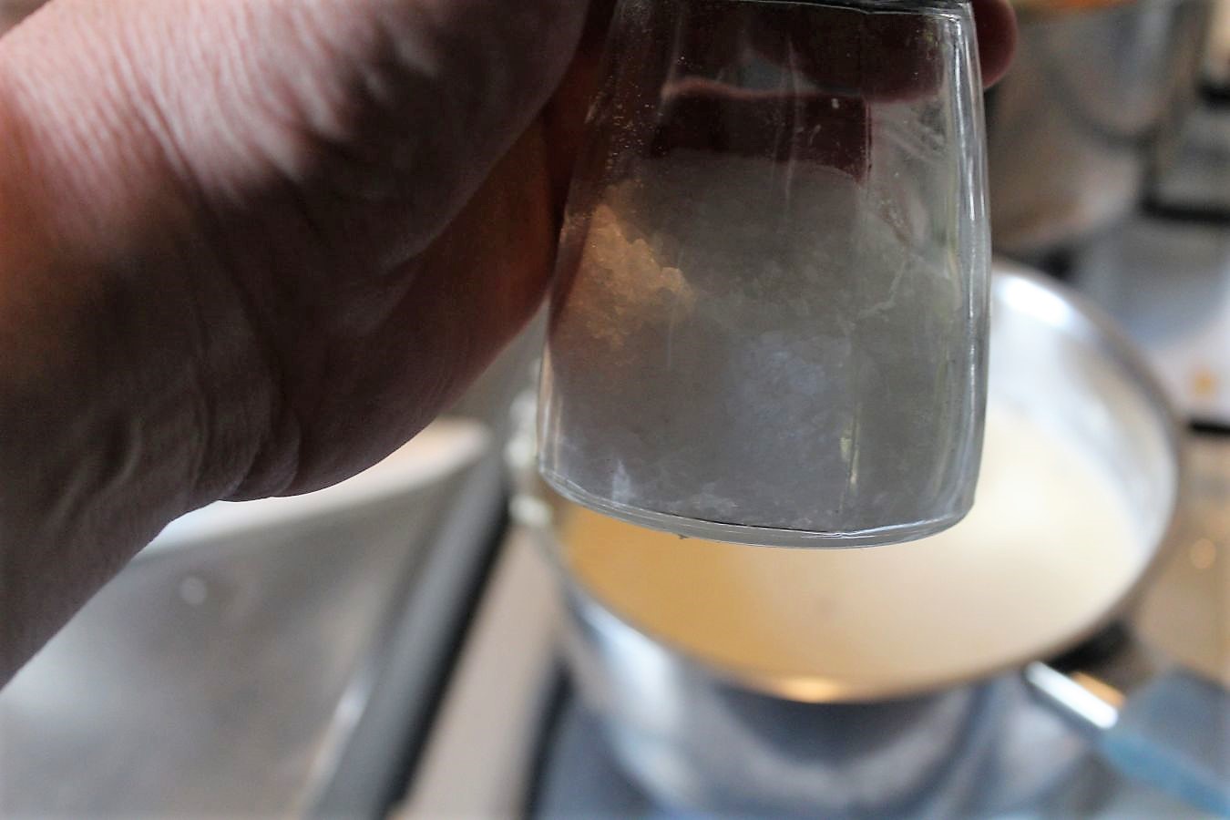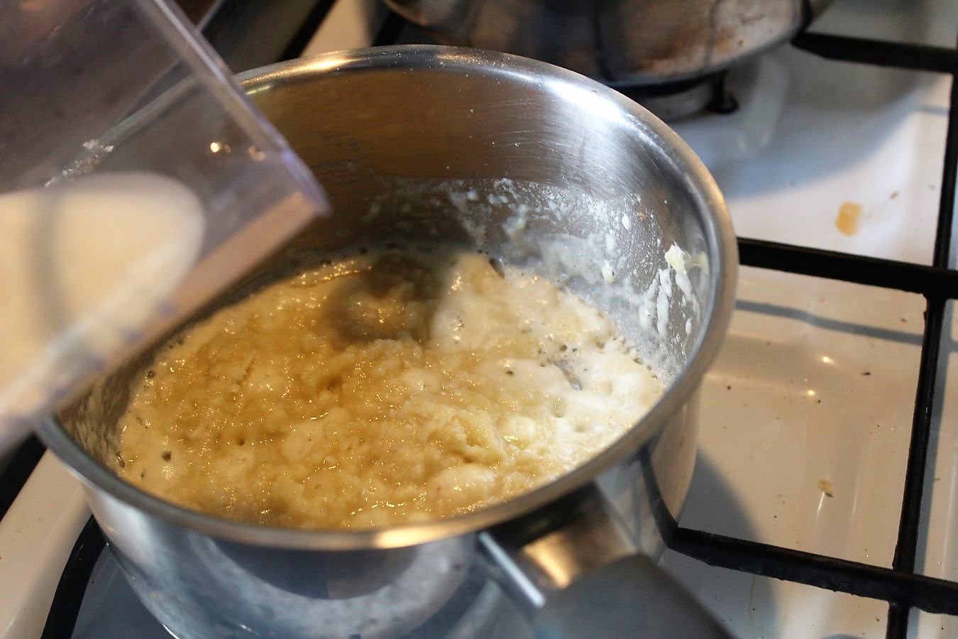 Die Milch unter ständigem Rühren in den Topf geben.