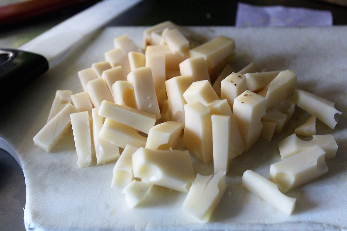 Käse schneiden, oder reiben. Ihr könnt nehmen was Haus und Hof hergeben, Gouda, Edamer, Emmentaler, oder was gerade weg muss.