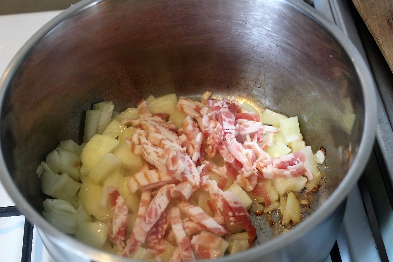 Den zerkleinerten Bacon zu den Zwiebeln in den Topf geben.