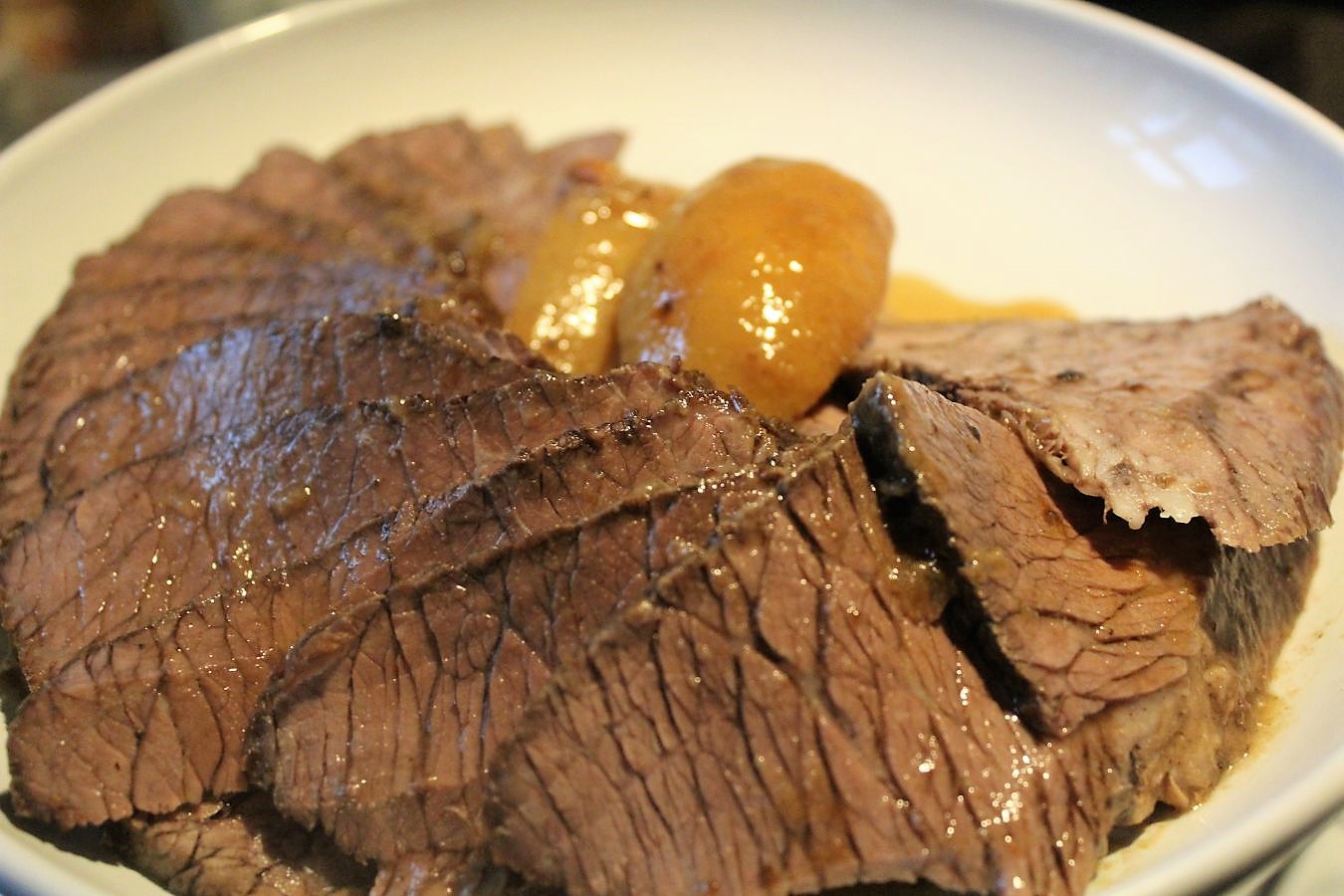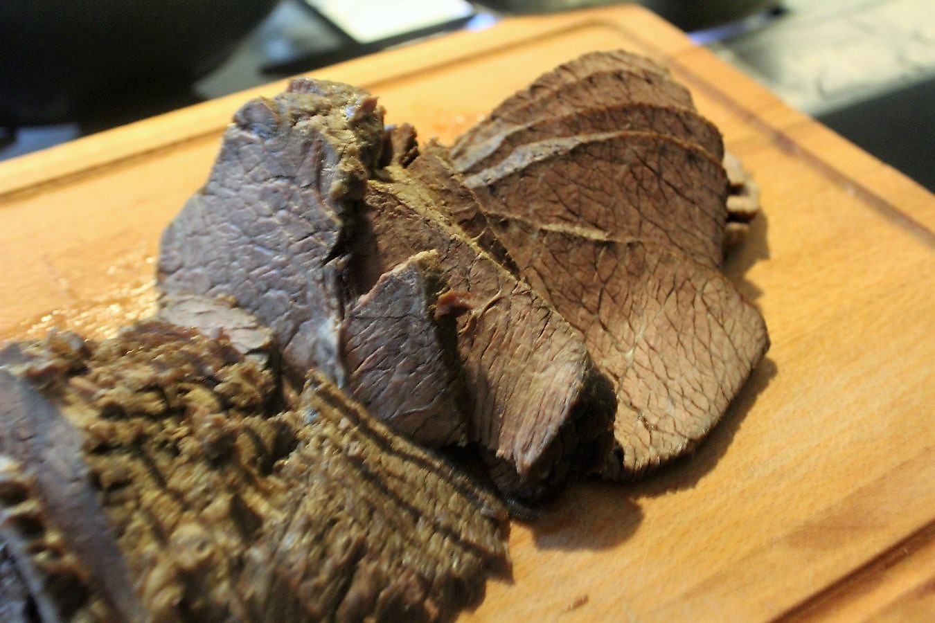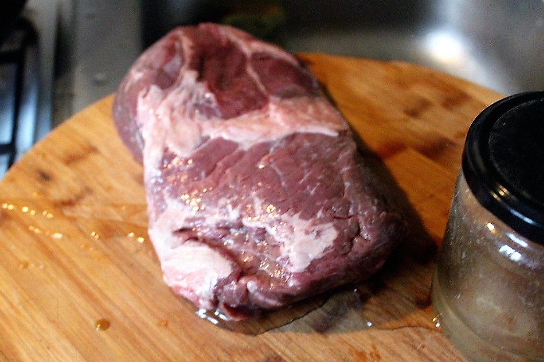 Das ist ein 1,3 Kilo Stück Rindernacken. Man kann natürlich auch mehr nehmen, weniger wäre schon eher schade, weil es so gut schmeckt und es verbrät ja auch noch einiges vom Rohgewicht.