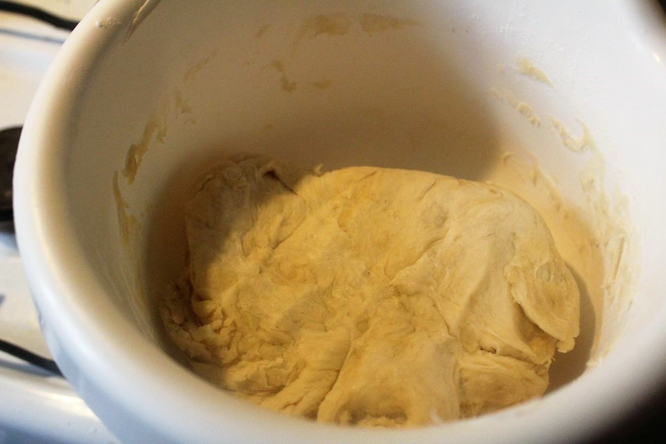 Den Teig mit dem Esslöffel rühren, bis es nicht mehr weiter geht, den Rest mit der Hand kneten und eine Kugel formen.