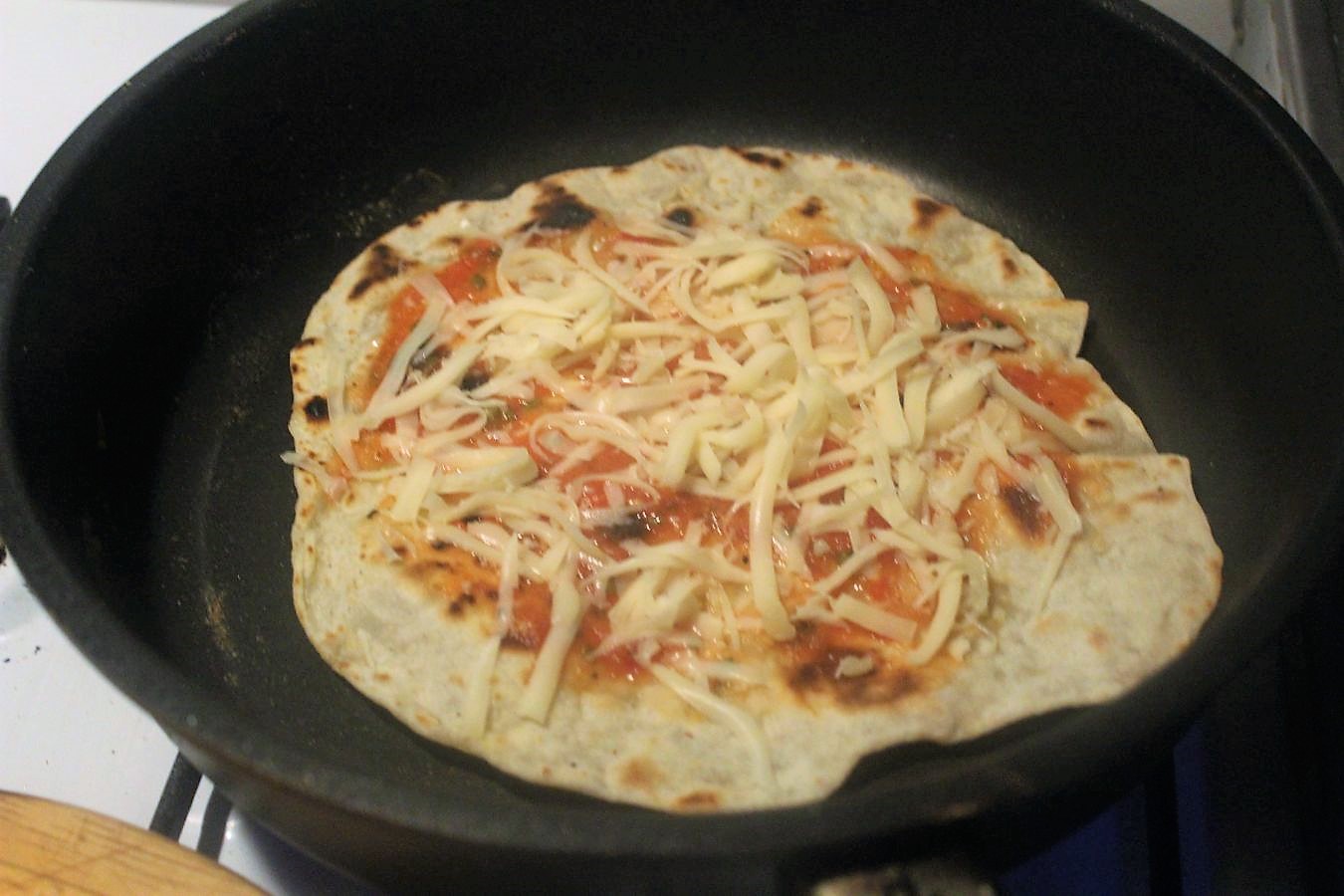 Die Idee eine Pizza in der Pfanne zu machen, hat mich schon ganz lange gereizt, aber mir war nicht klar, wie ich das mit meinem angestammten Hefeteig machen sollte. Deswegen habe ich mich erst einmal an das gehalten, von dem ich weiß dass der Teig funktioniert, nämlich eine Abwandlung meines Teiges für Tortillafladen.