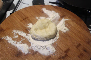 Das Teigstück im Mehl wenden, damit es beim Ausrollen nicht am Brett festklebt.