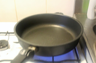 Die Pfanne auf dem Herd ohne Fett erhitzen. Größte Platte, volle Pulle. Ich rede von Gas, nicht von Induktion.