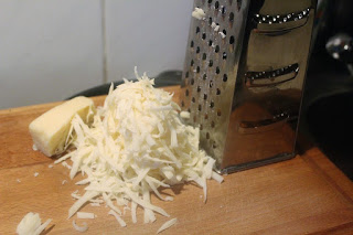 Käse reiben. Idealerweise hätte ich für die Pizza Mozzarella genommen, aber da ich den Einfall sehr spontan hatte, musste ich nehmen, was ich im Kühlschrank hatte. Da war Emmentaler, aber es geht immer Euer Lieblingskäse, den Ihr sonst auch auf Pizza mögt.