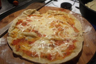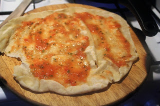 Dann den Teig schnell aus der Pfanne holen und die Seite, die schon auf dem Pfannenboden war mit der Tomatensoße bestreichen.