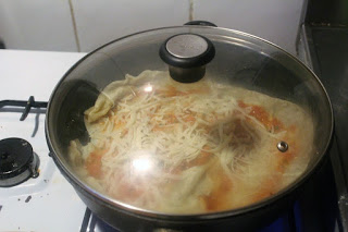 Die Pizza wieder in die Pfanne legen und ganz wichtig, den Deckel auf die Pfanne legen, weil sich die Wärme sammeln muss, damit der Käse schnell schmilzt.