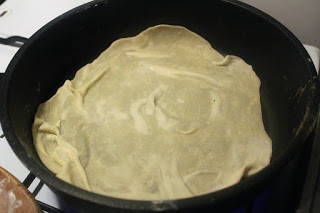 Den Teig mit dem Nudelholz ausrollen. Die Pfanne hat 28 cm Durchmesser und so sollte auch der Teig ausgerollt sein.