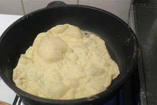 So lange warten, bis der Teig solche Blasen wirft. Das sollte ca 2 Minuten dauern. Herd läuft immer noch volle Pulle.