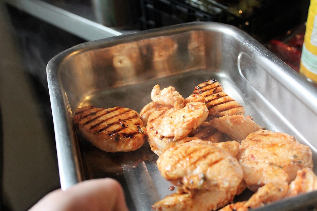 Das Hähnchenfleisch pro Seite drei Minuten in der Pfanne braten. Eine Grillpfanne macht ein schönes Muster. Gleichzeitig den Backofen auf ca 80 Grad vorheizen, damit das Fleisch noch weiter gar zieht, ohne zäh zu werden