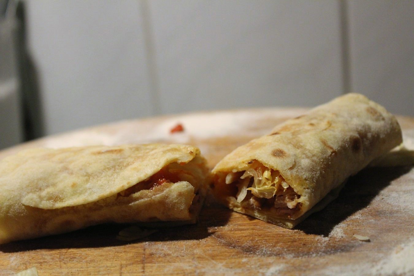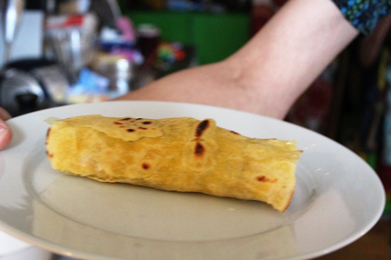 Da habe ich noch mit den Tortillas experimentiert, ob sie sich besser rollen lassen, ohne zu reißen, wenn man sie nicht so stark backt. Das funktioniert ganz gut.