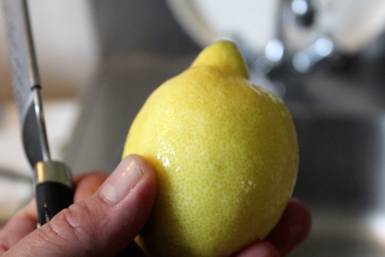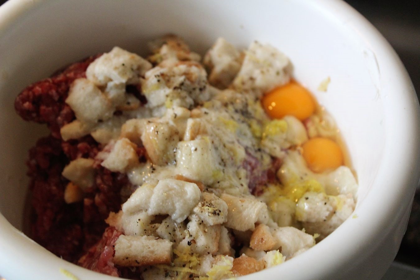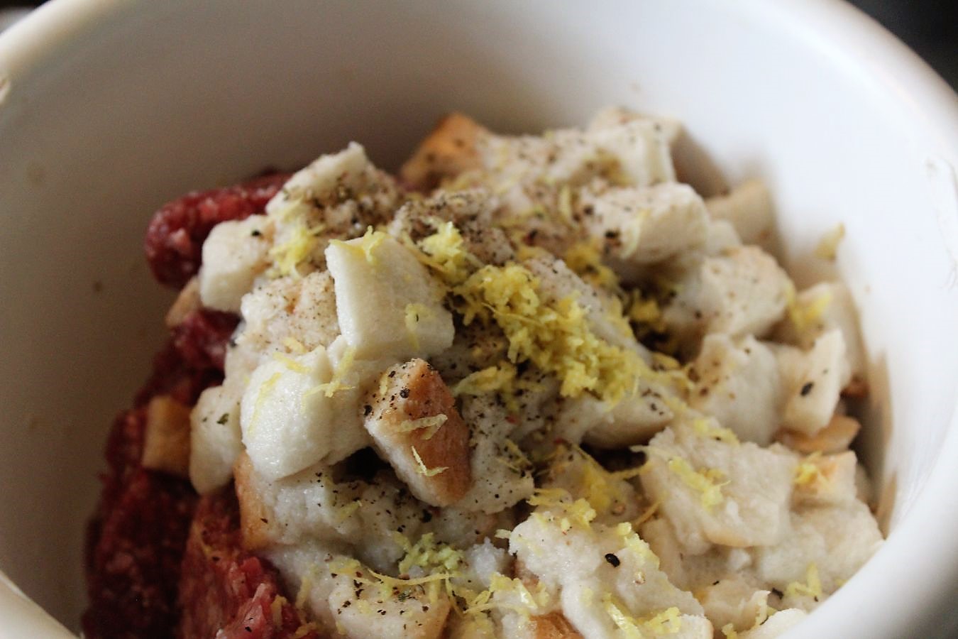 Bei einer bio Zitrone die Schale abreiben und den Abrieb ebenfalls zum Hack geben.