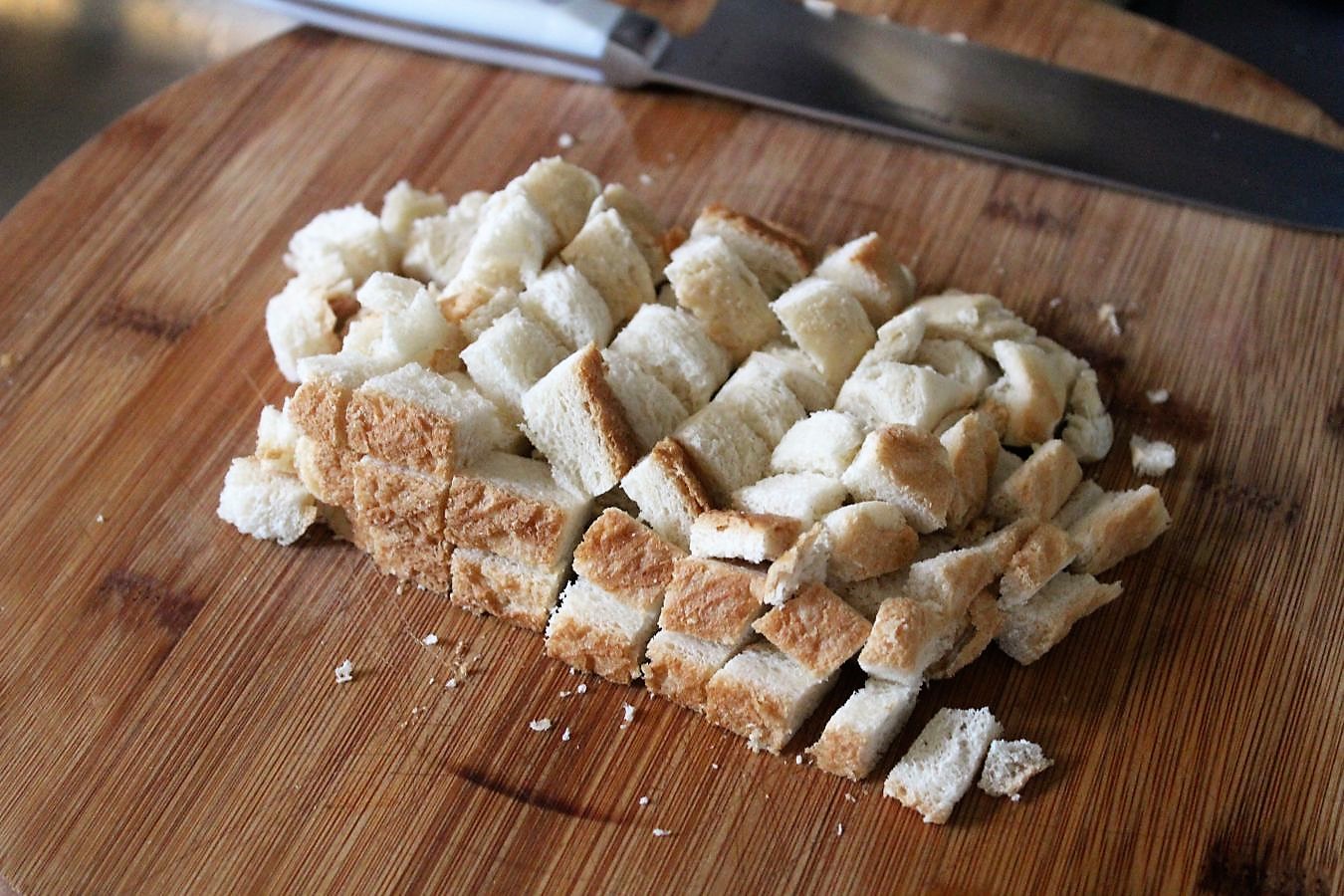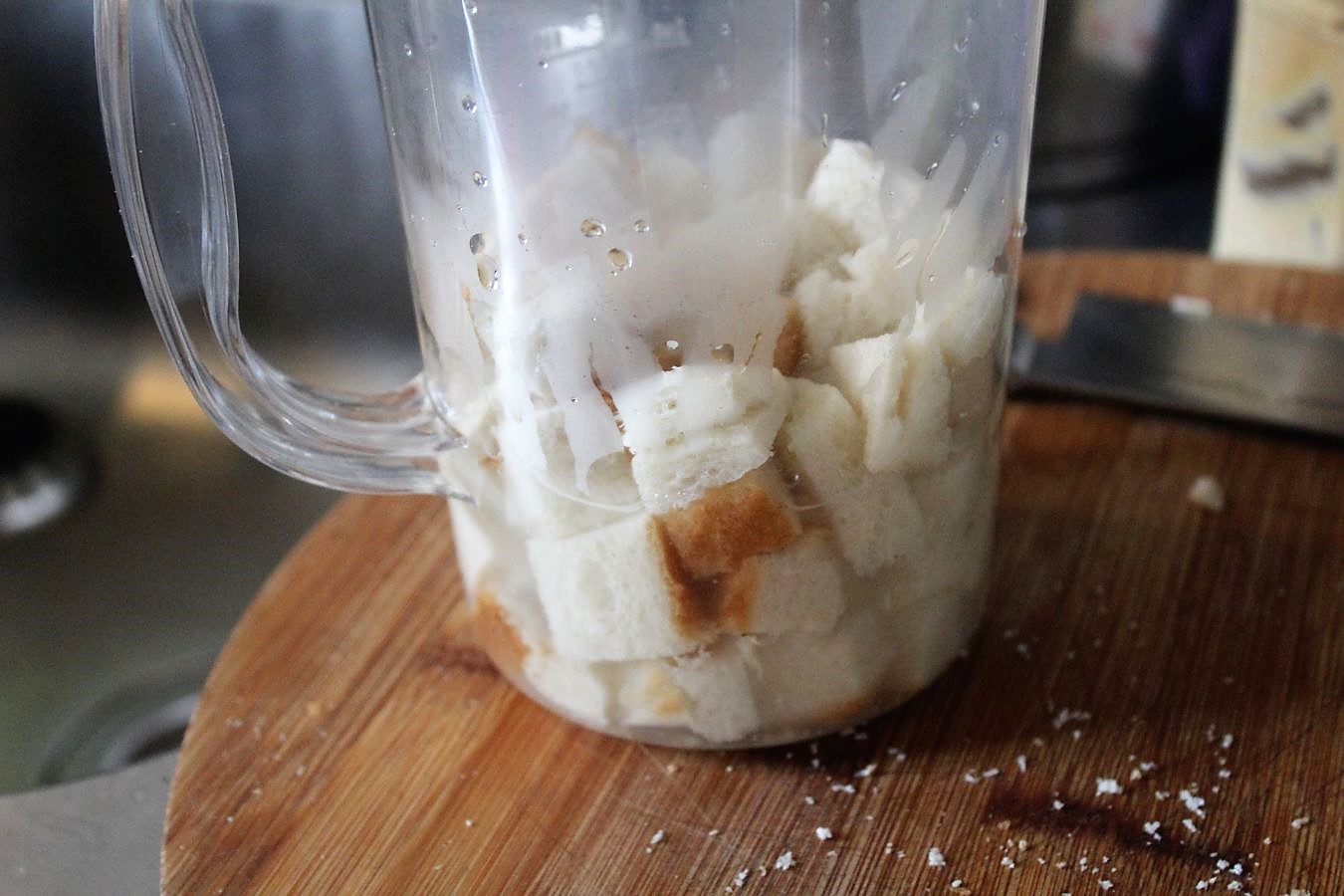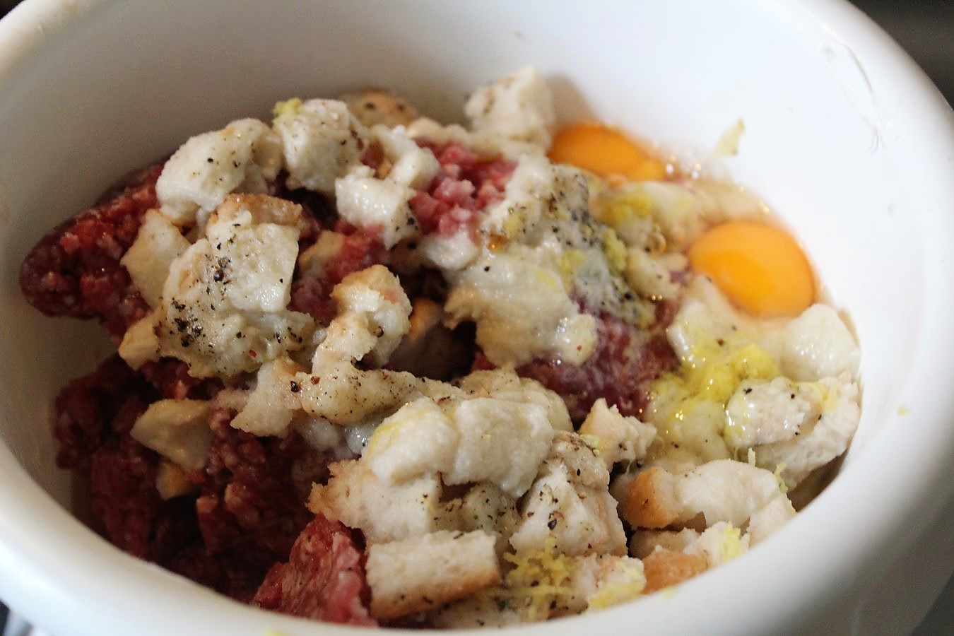 Das aufgeweichte Toastbrot kurz auspressen und zum Hackfleisch geben.