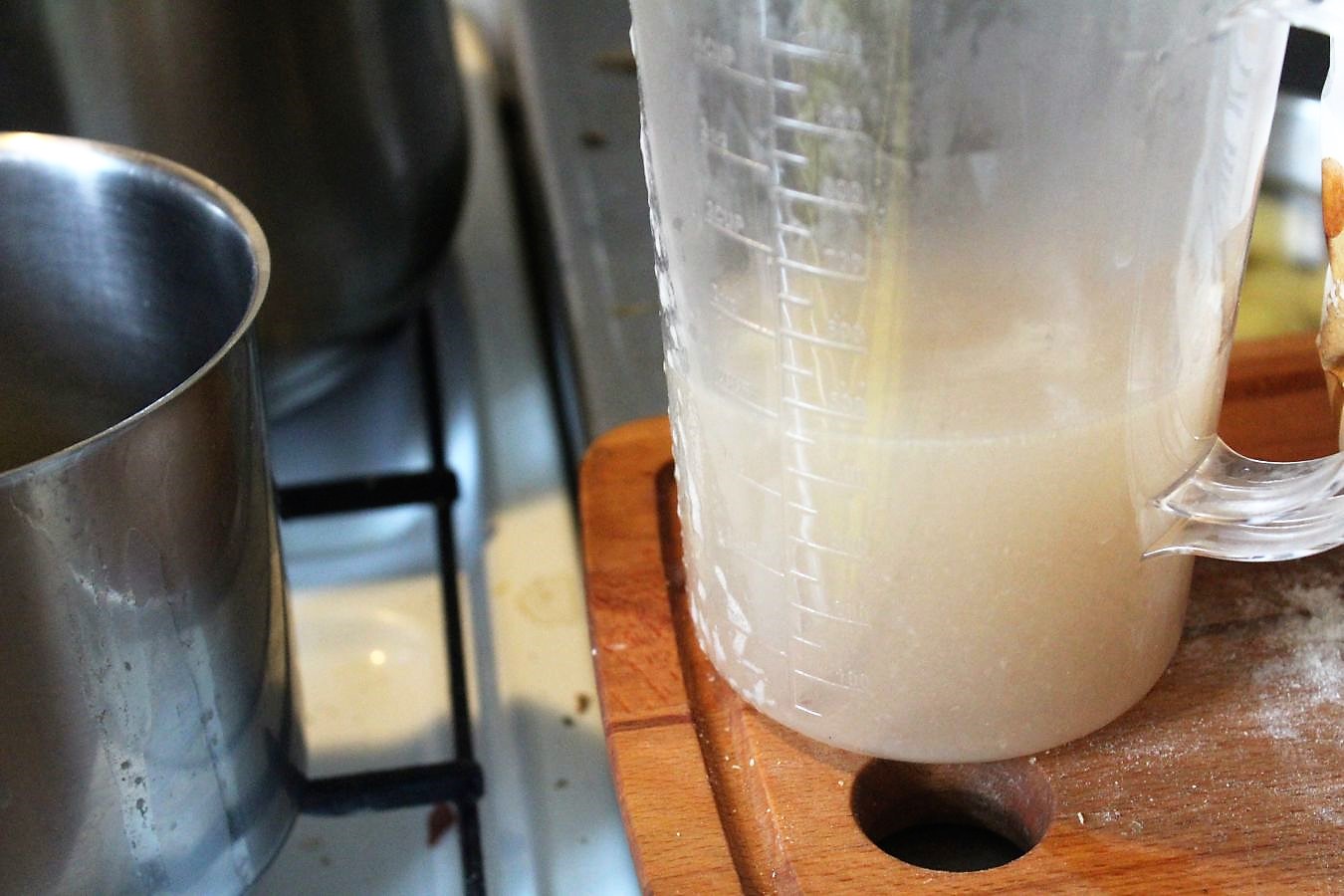 500 Milliliter der Kochflüssigkeit der Klopse abnehmen und von Feststoffen filtern.