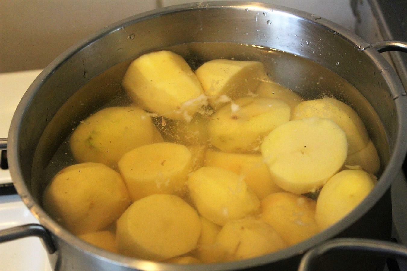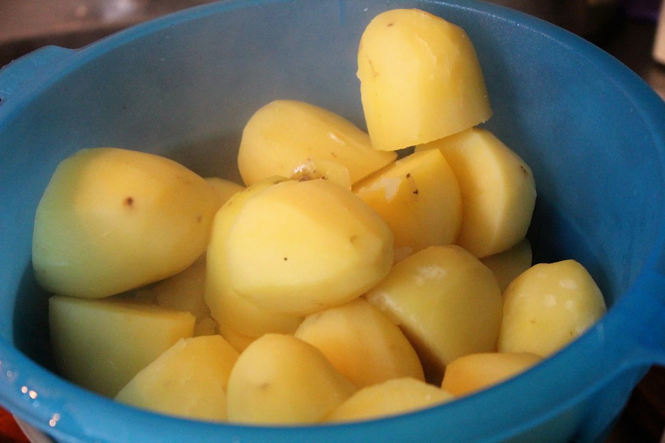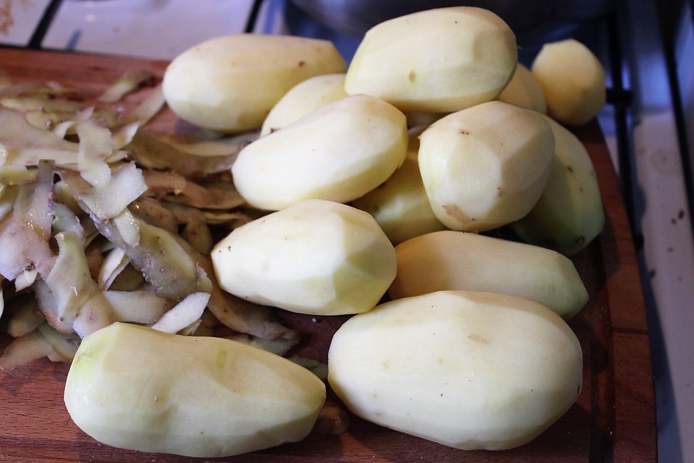 Als Beilage Kartoffeln schälen und in 20 Minuten in Salzwasser gar kochen.