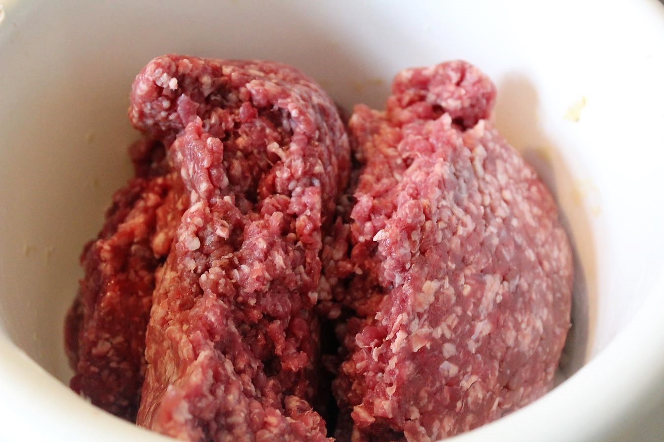 Hackfleisch verkneten. Wer es jetzt ganz gut machen möchte, kann die Masse noch einmal durch eine ganz feine Scheibe beim Fleischwolf jagen, damit die Masse fast so fein wird wie Wurstbrät. Ich habe habe leider keine ganz feine Scheibe, deswegen habe ich es gelassen.