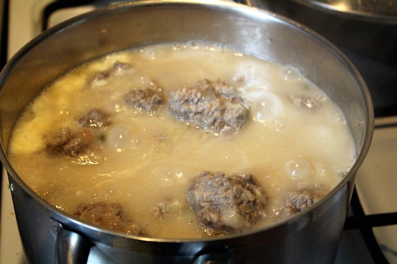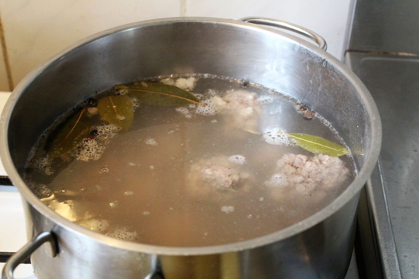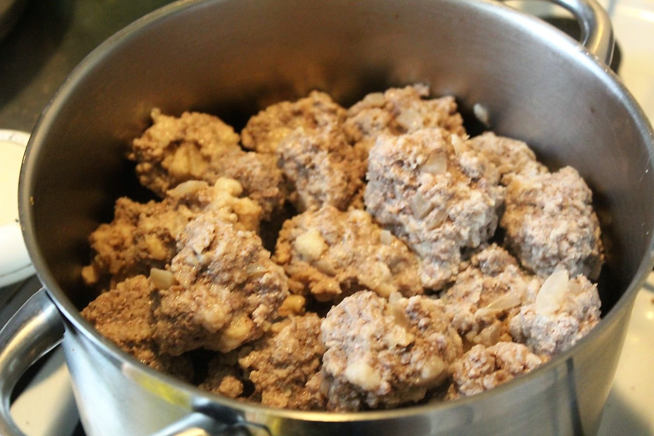 Wenn das Wasser kocht, den Herd auf die kleinste Stufe reduzieren. Die Klopse sollen nur gar ziehen und nicht siedend gekocht werden. Dann neigen sie zum Zerbröseln.