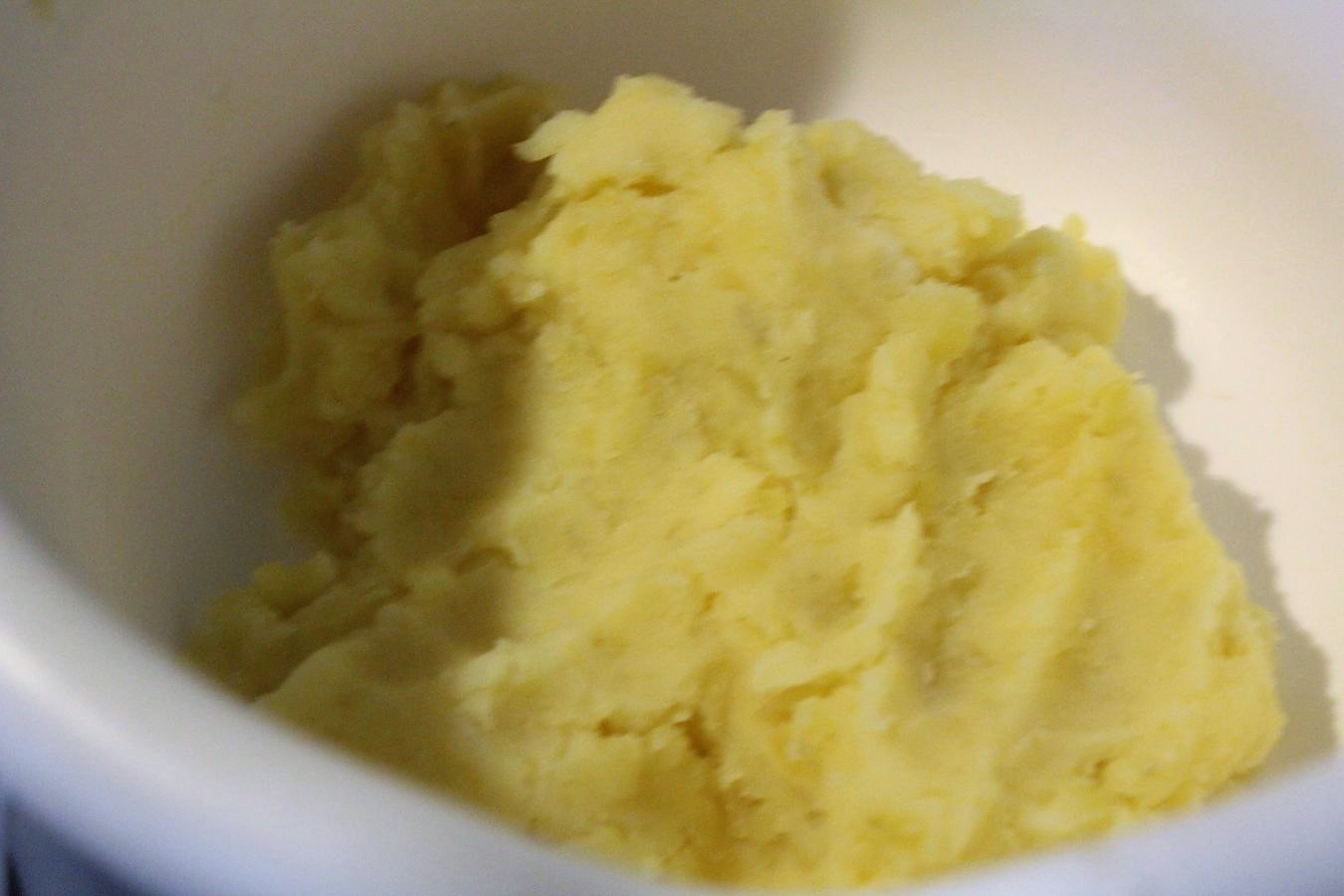 300 Gramm Kartoffeln stampfen, oder durch die Kartoffelpresse drücken.