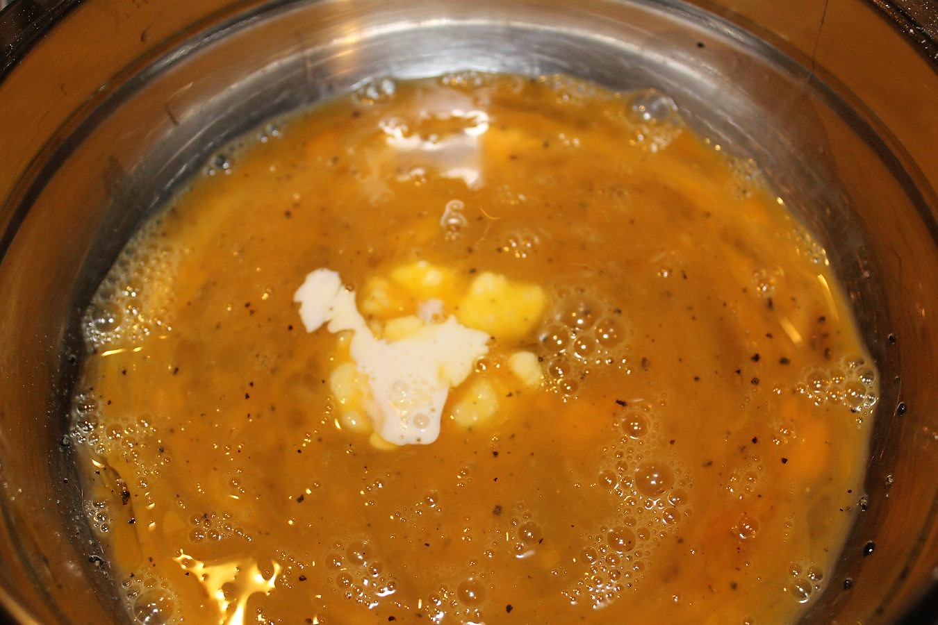 Das verquirlte Ei veredel ich noch mit einem Schuss Sahne, damit die Panierung lockerer wird.