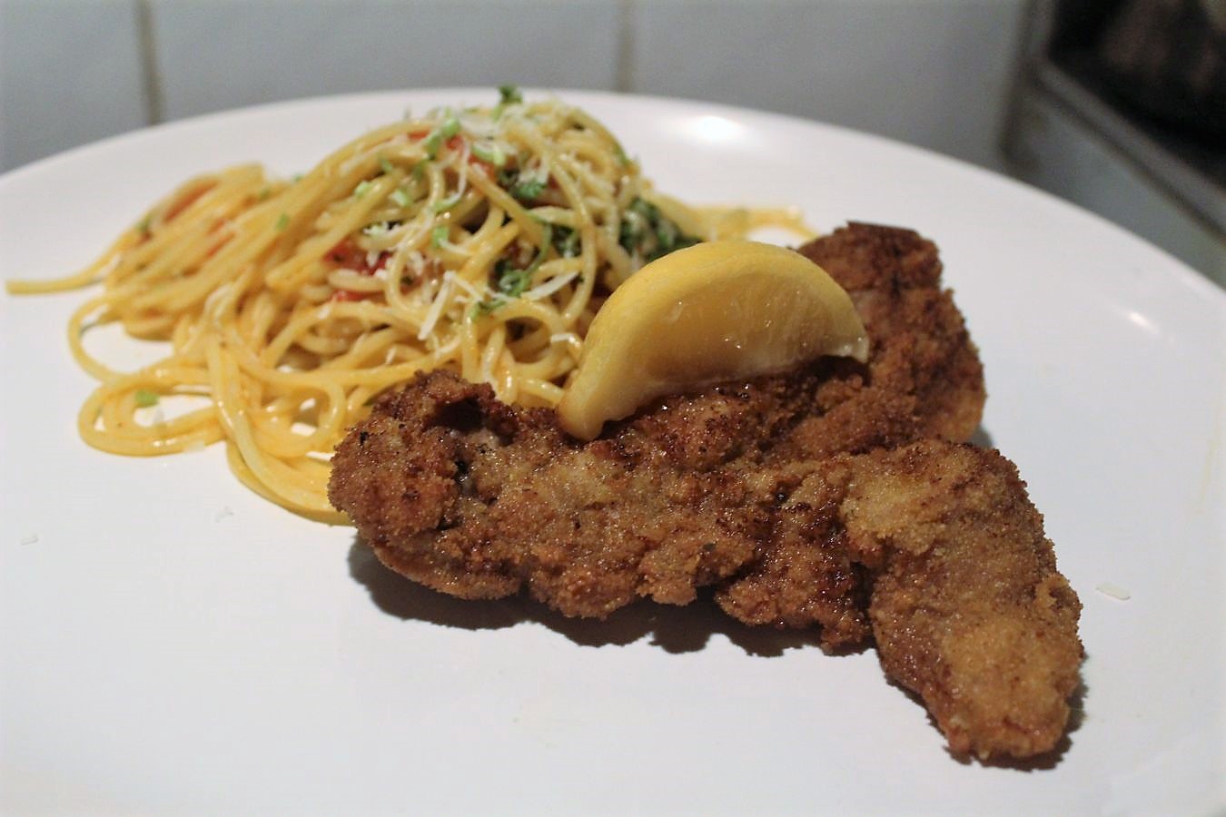 Um Mitternacht sitzen wir schon am Tisch. Das schmeckt natürlich auch mittags, oder pünktlich um 18 oder 19 Uhr, wenn Ihr einen anderen Tagesablauf habt. Das Fleisch ist schön zart, die Panierung ist toll kross. Die Nudeln mit der Soße sind ein Traum, Koriander und ich werden in diesem Leben keine Freunde mehr. War jetzt nicht schlimm, aber mit Petersilie hätte es mir noch deutlich besser und weniger seifig geschmeckt. Wer Koriander mag, dem wird das natürlich gefallen, aber ich werde mir in Zukunft die Petersilie deutlicher kenntlich machen, falls ich beides im Kühlschrank habe.
