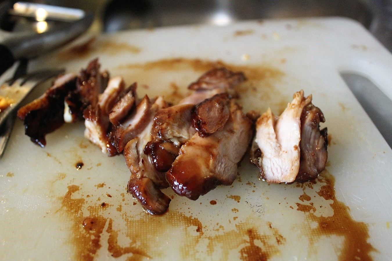 Ich habe Oberkeulen vom Huhn genommen. Da ist nur noch ein Knochen dran, den man mit einem gezielten Schnitt gut entfernen kann. Die sind echt meine absoluten Favoriten, weil sie total zart werden, durch die Haut sehr saftig sind und die Knochen kann ich gleich noch zum Brühe kochen verwenden.