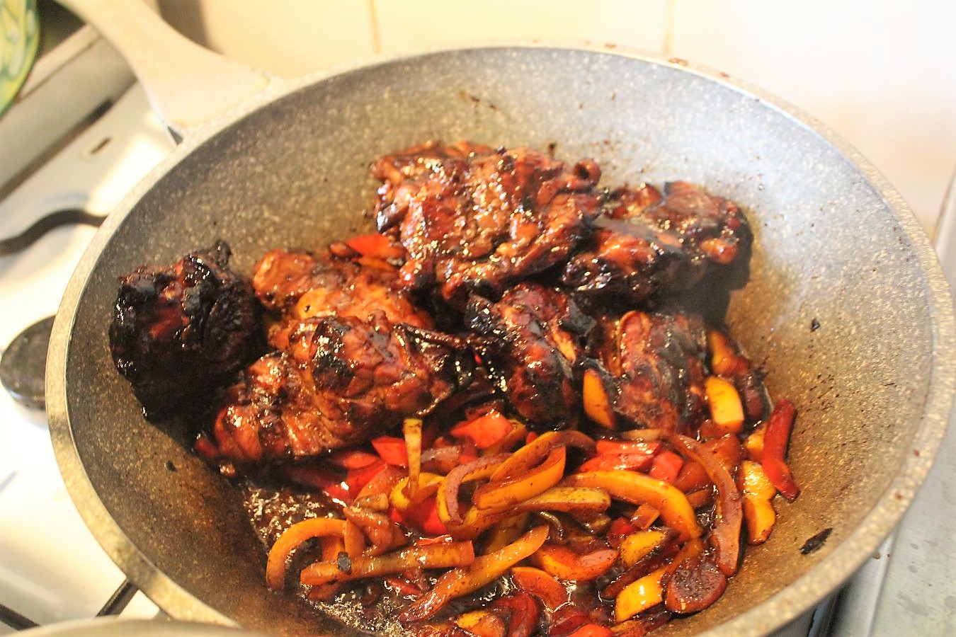 Einer geht noch. Zwei Peperoni wollen auch mal verbraucht werden. Das Fleisch mindestens 20 Minuten marinieren lassen. Eine Nacht im Kühlschrank wäre noch besser.