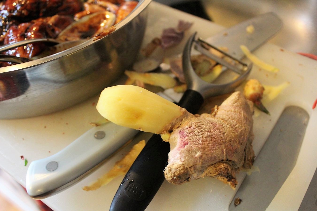 Ingwer in dünne Scheiben schneiden und ebenfalls zum Fleisch geben.