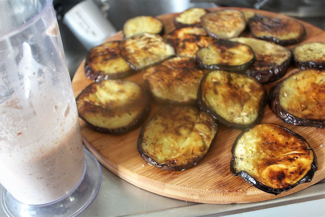 Die gebratenen Auberginenscheiben abkühlen lassen.