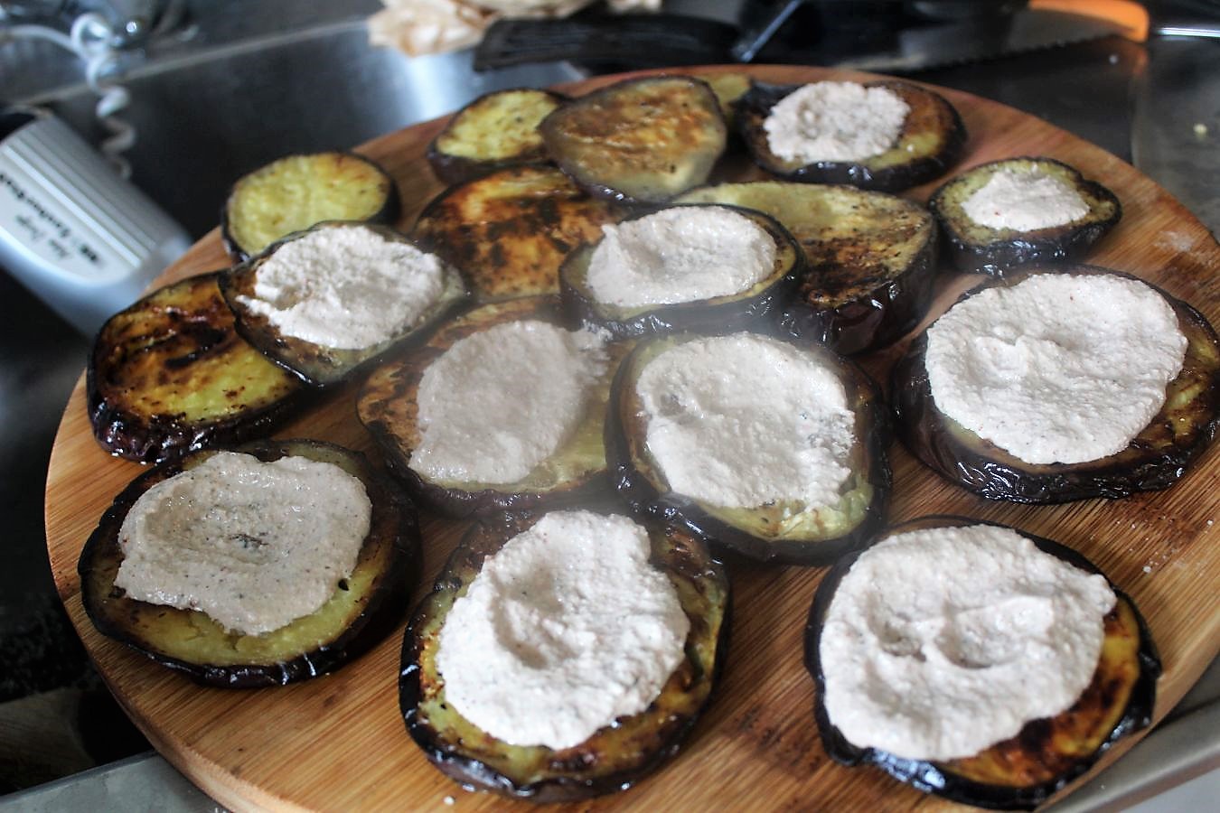 Danach werden die Auberginenscheiben mit der Walnusspaste bestrichen.