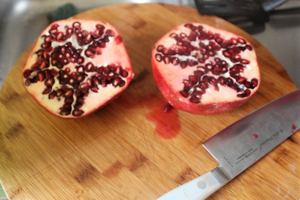 Ich beschreibe das hier, so gut ich kann. Also erstmal den Granatapfel halbieren