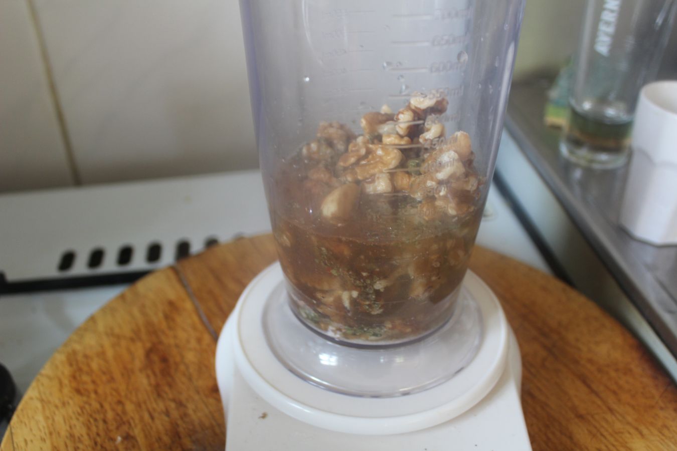 Jetzt schnell mit dem Pürierstab alle Zutaten zu einer Creme verarbeiten, die in der Wartezeit bis die Auberginen gebraten und abgekühlt sind, auch noch ein wenig anzieht, also dicker wird.