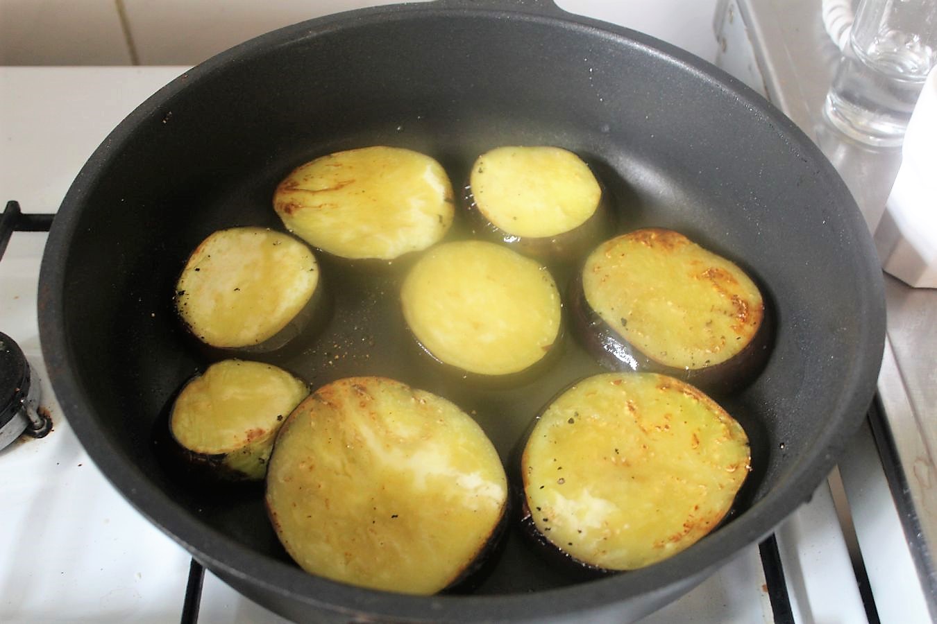 Auf mittlere Hitze runterdrehen, damit die Auberginen zu dunkel werden.
