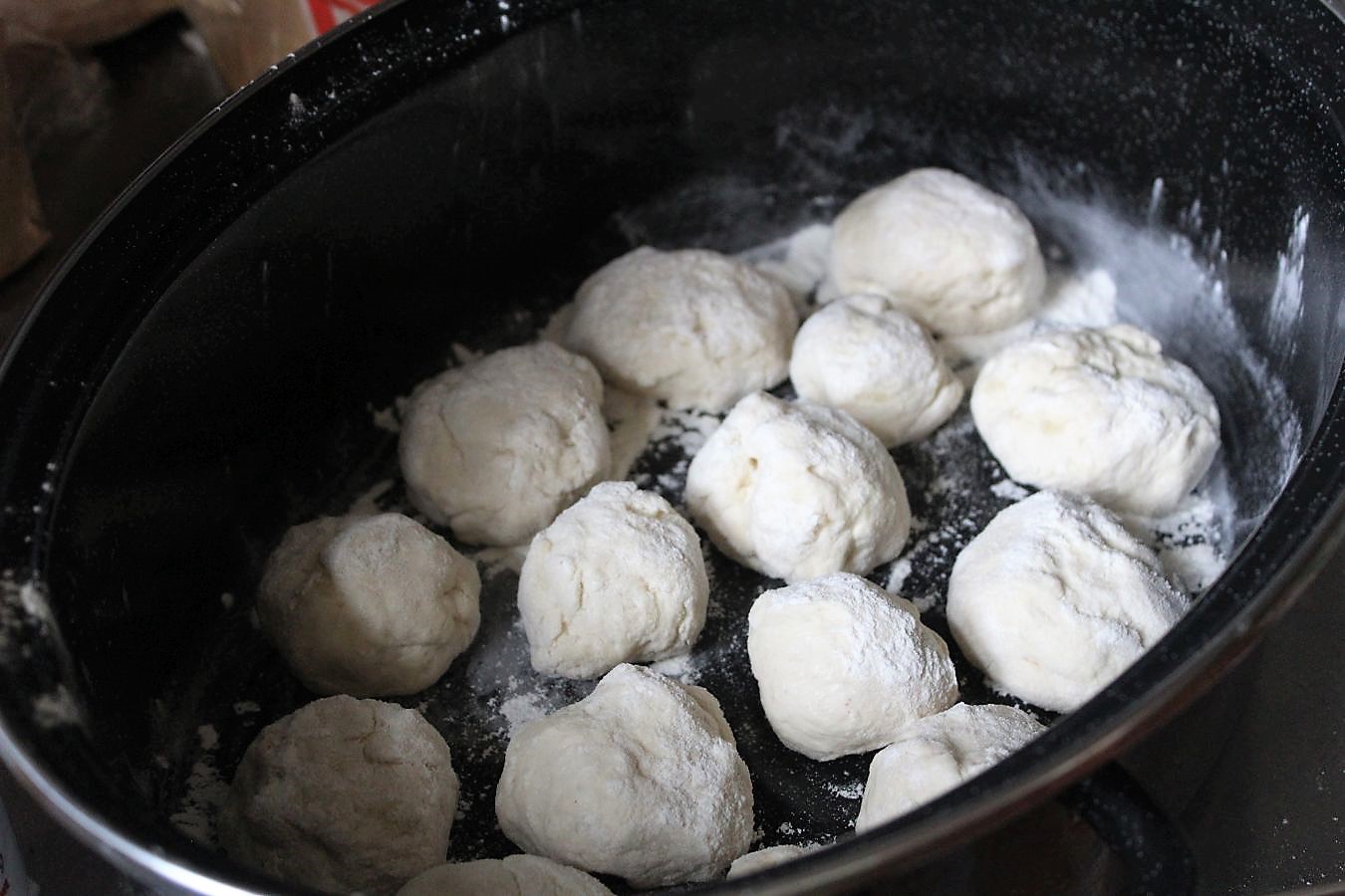 Weil mein Ofen nur Unterhitze hat, backe ich wegen der besseren Wärmeverteilung abgedeckt in einem Geflügelbräter. Das soll angeblich auch in moderneren Öfen mit Ober- und Unterhitze zu besseren Ergebnissen führen. Erst einmal lasse ich die rohen Teiglinge noch mal im Bräter eine halbe Stunde aufgehen. Hier vorher…